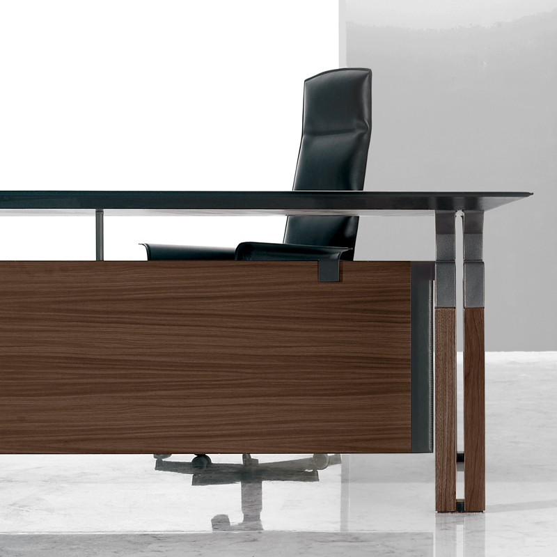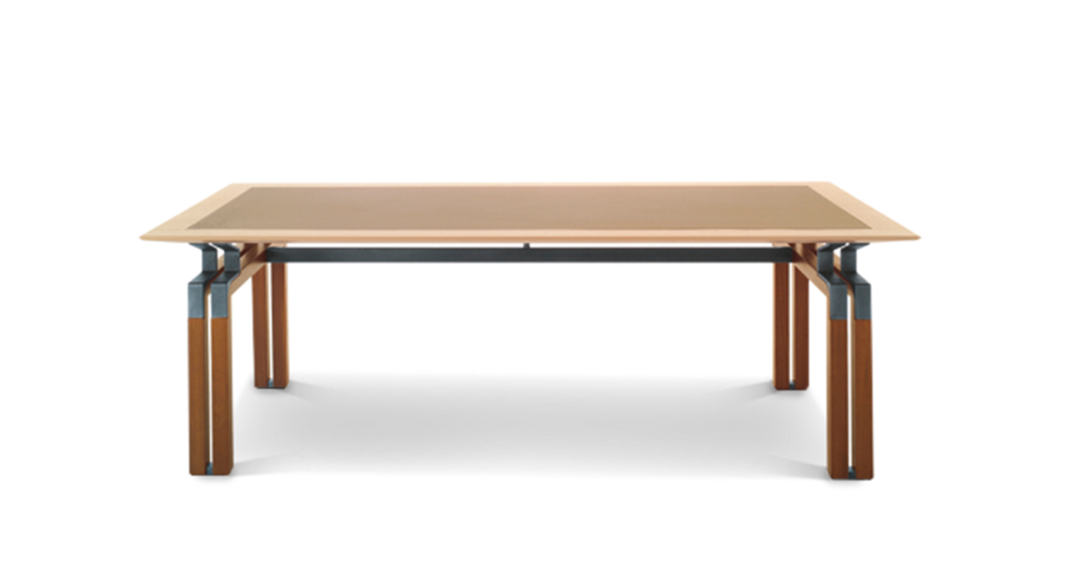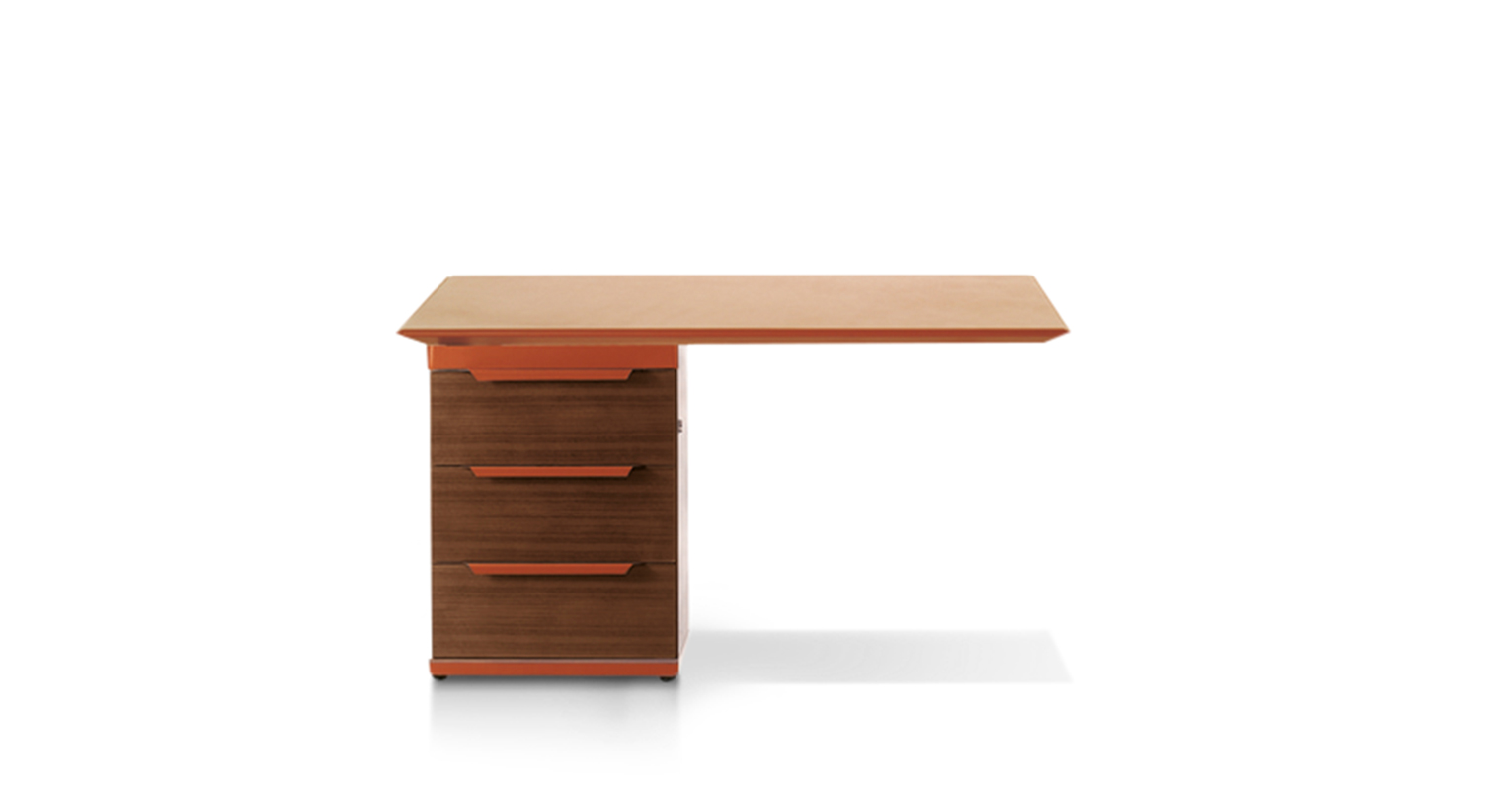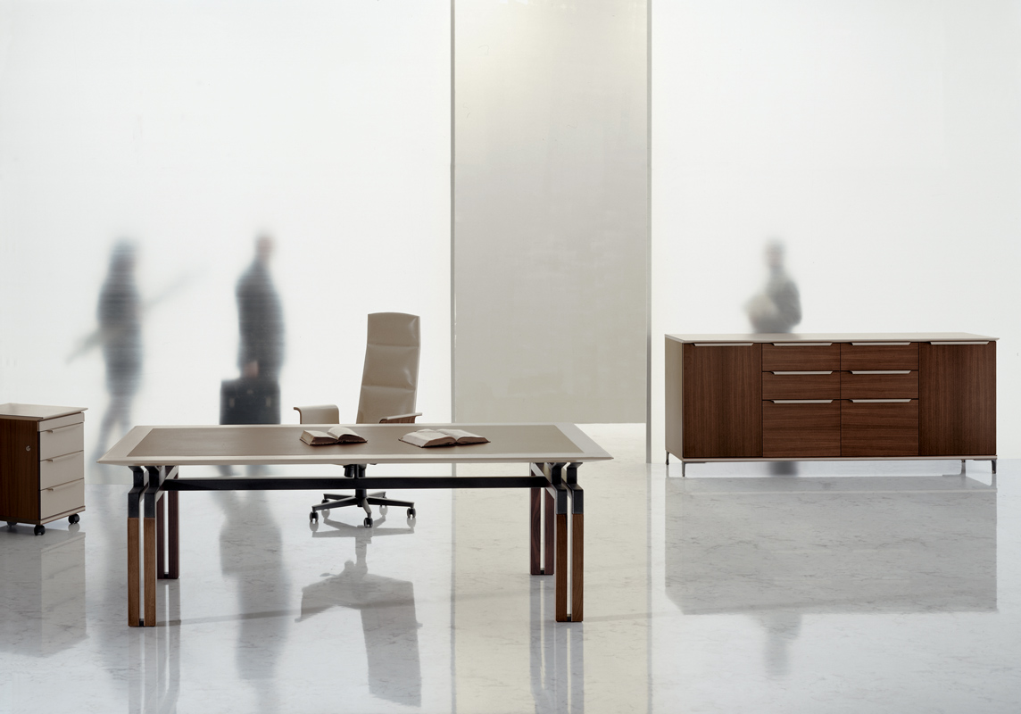 Простой и изящный мольберт складывается в два ряда на коротких сторонах стола. “Формальная настойчивость”, повторение, удвоение, сведение более компактной и массивной ножки к ее собственному каркасу, к ее собственным краям, к ее собственным границам. От мольбертов начинаются металлические кронштейны, также сдвоенные, имеющие форму ломаной линии, которые поддерживают легкую подвесную поверхность: своего рода воздушное покрытие более прочной архитектурной конструкции внизу. Вся геометрия и тонкие взаимосвязи между элементарными формами, из которых состоит эта серия, продуманы до мелочей, тщательно контролируются, планируются и подчиняются своим собственным четким правилам. Как в балете, где кажущаяся естественность шагов и движений ритуально соответствует заранее установленным и бесконечно повторяемым образцам. Контейнеры также рассчитаны на повторение. “Формальное заикание” используется как средство для восстановления смысла и привлечения внимания к слушанию. Таким образом, повторяющимся элементом является тонкая и длинная ручка из сложенной седельной кожи.