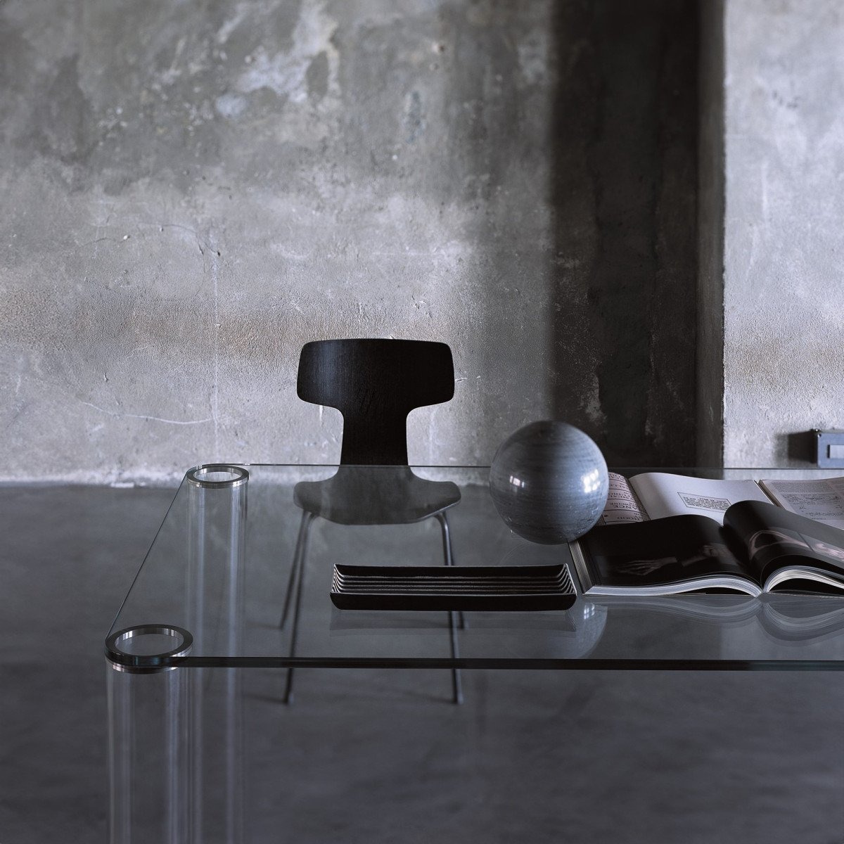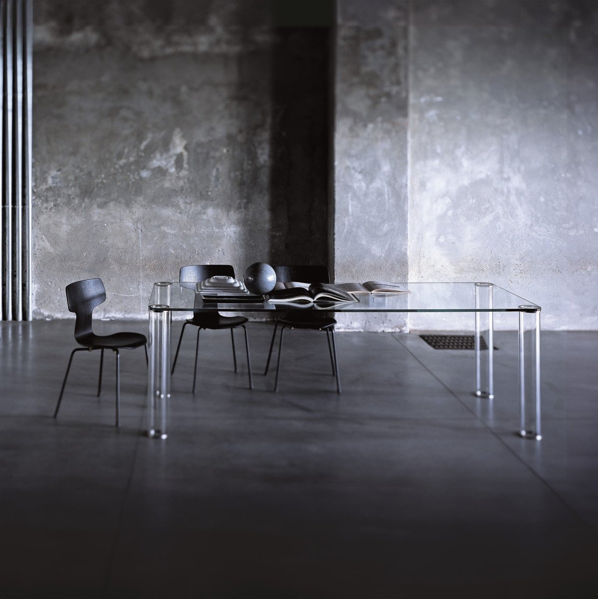 Серия высоких столов прямоугольной, квадратной и круглой формы. Столешница из закаленного стекла толщиной 15 мм изготавливается из прозрачного сверхлегкого стекла и глянцевого лакированного стекла. Цилиндрические ножки изготовлены из прозрачного боросиликатного стекла.
