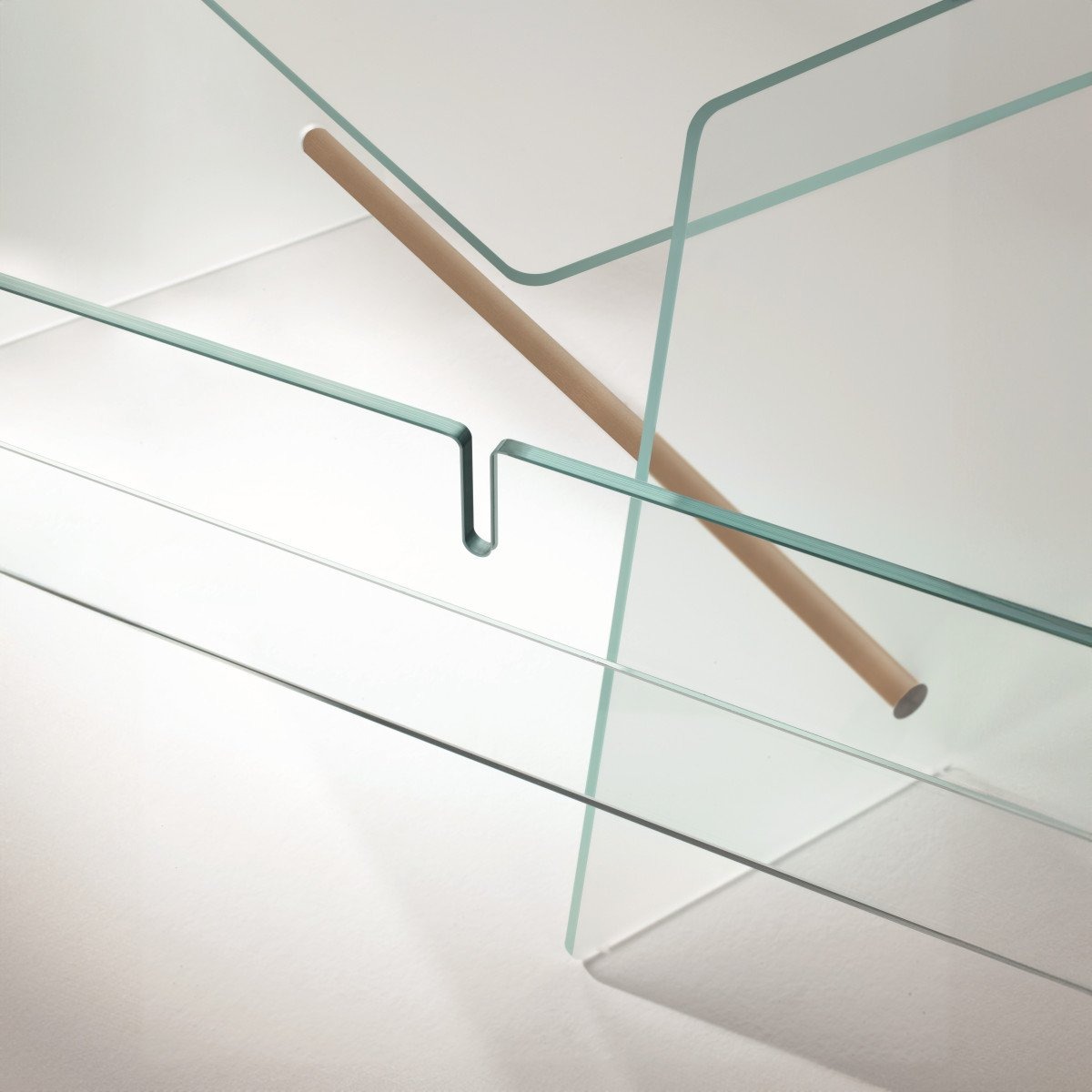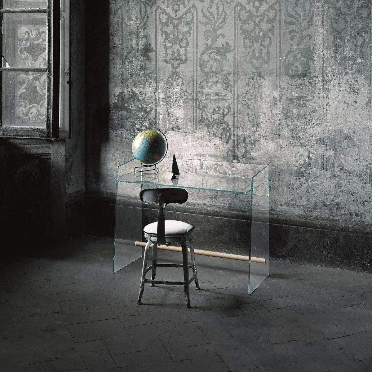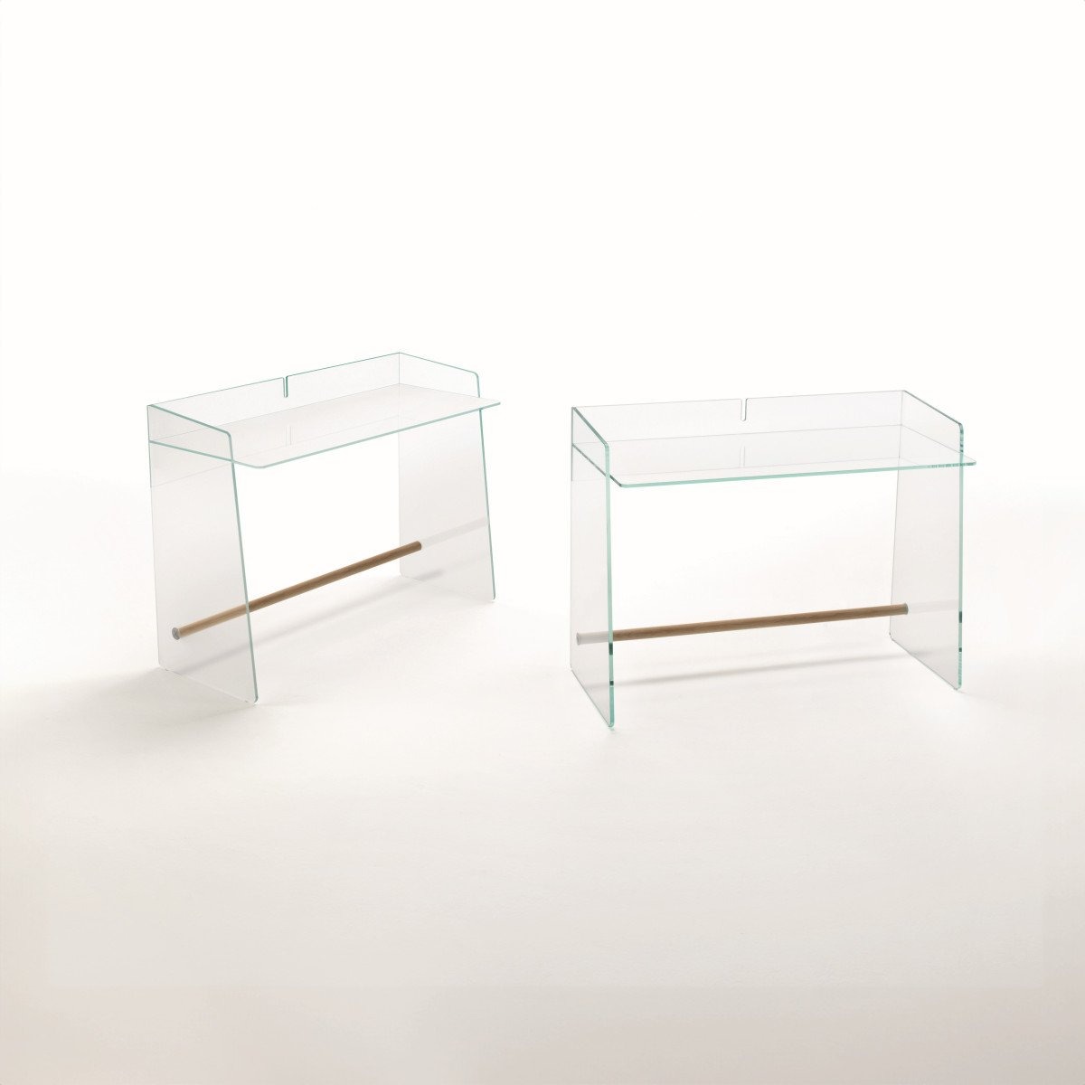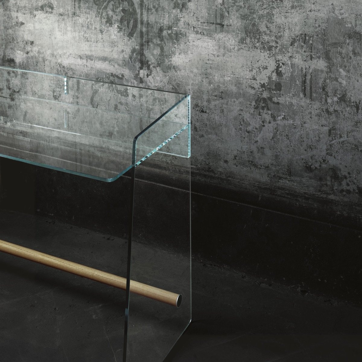 Письменный стол из прозрачного сверхлегкого стекла, закаленного и термосвариваемого. Доступен в двух различных размерах. Он поставляется с подставкой для ног из натурального ясеня. Тщательная проработка деталей и сбалансированные пропорции создают ощущение тонкой гармонии.