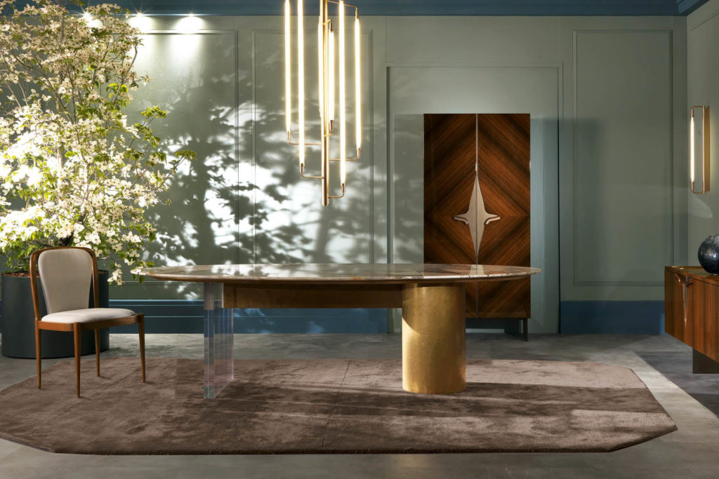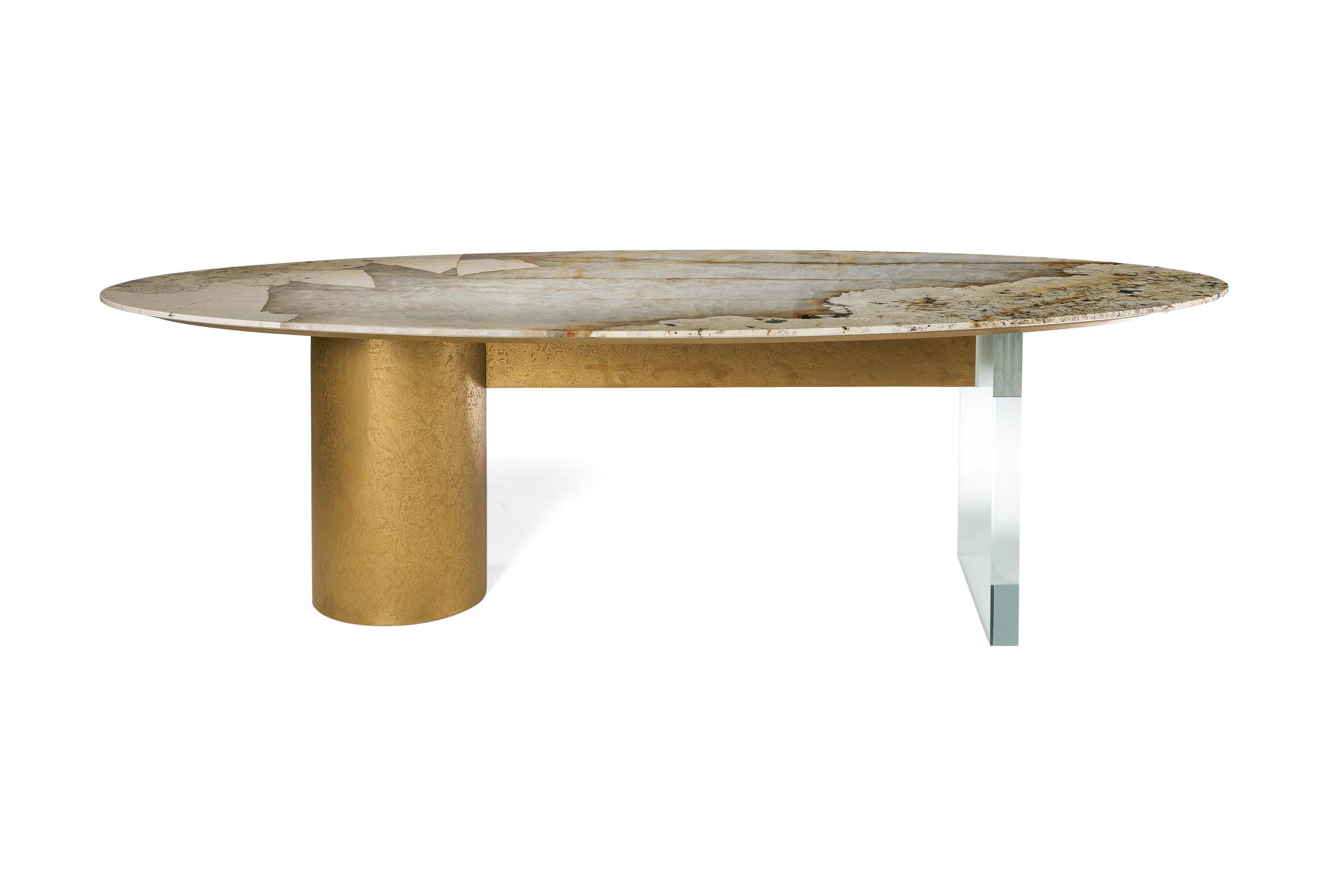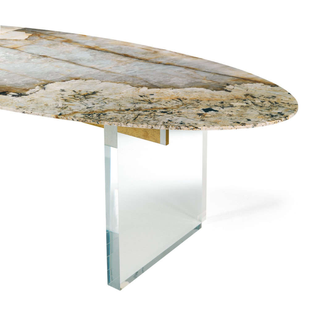 PLAYGROUND-это элегантный мраморный обеденный стол с деревянной основой и оргстеклом. Его жидкая металлическая отделка, сопровождаемая прозрачностью оргстекла, отражает яркость, придавая нотку современности и оригинальности всему контексту.