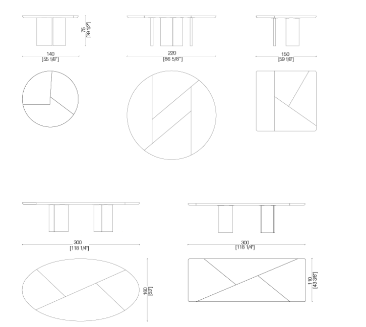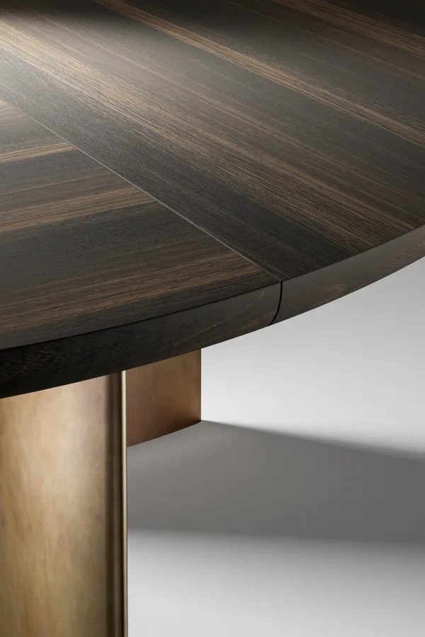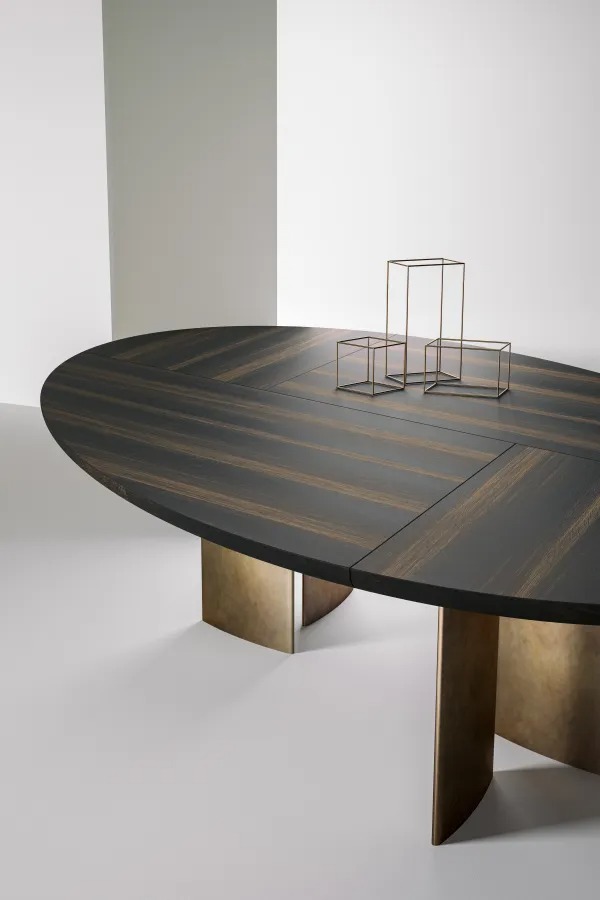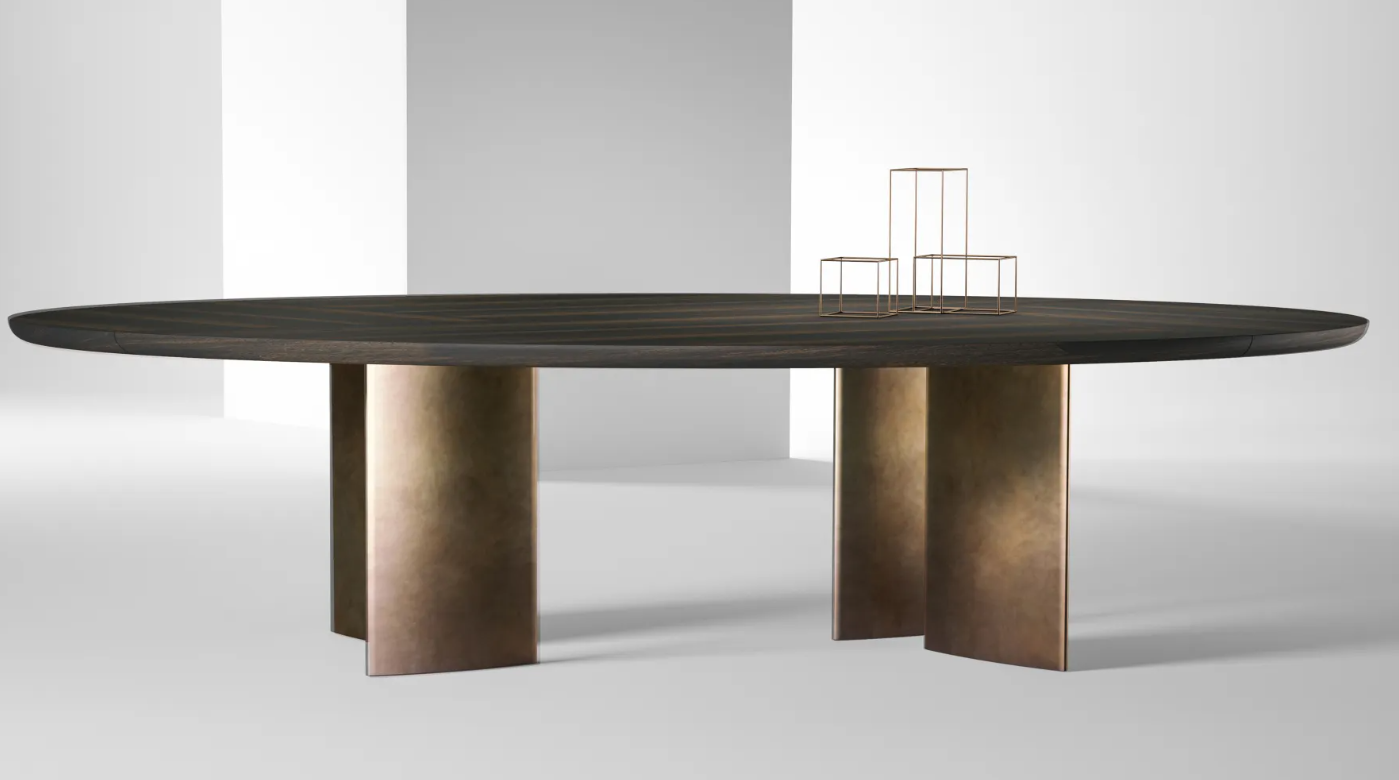 Стол с закругленной инкрустированной столешницей и ножками яйцевидного сечения, доступный в вариантах эллиптической, круглой, квадратной или прямоугольной формы, а также в различных размерах.