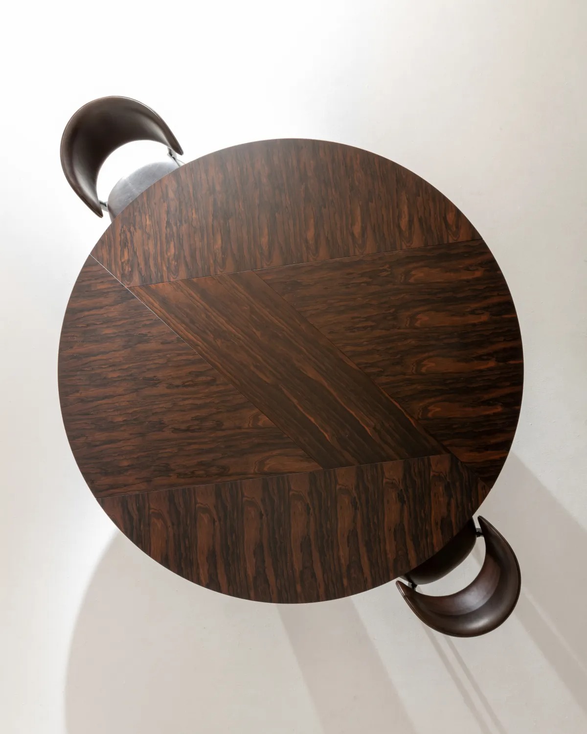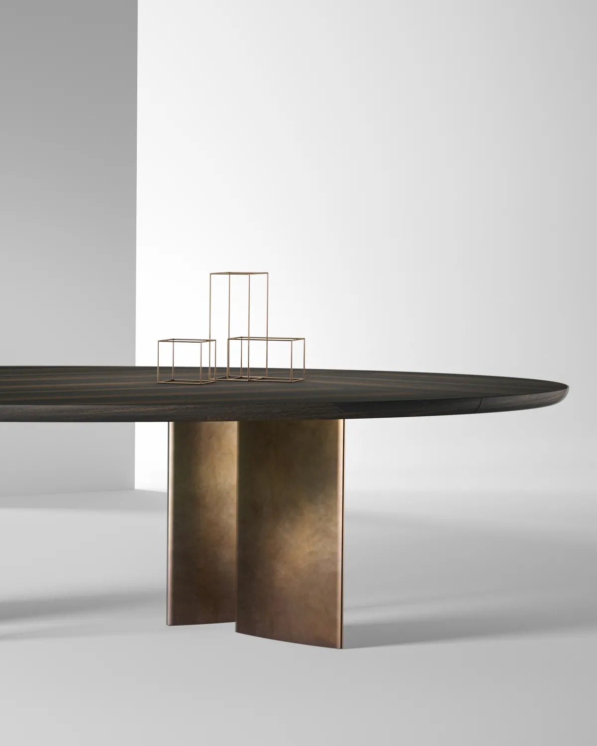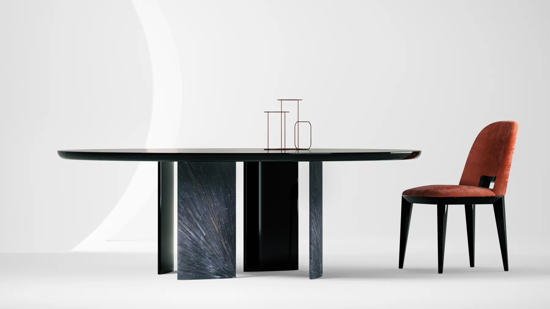 Стол с закругленной инкрустированной столешницей и ножками яйцевидного сечения, доступный в вариантах эллиптической, круглой, квадратной или прямоугольной формы, а также в различных размерах.