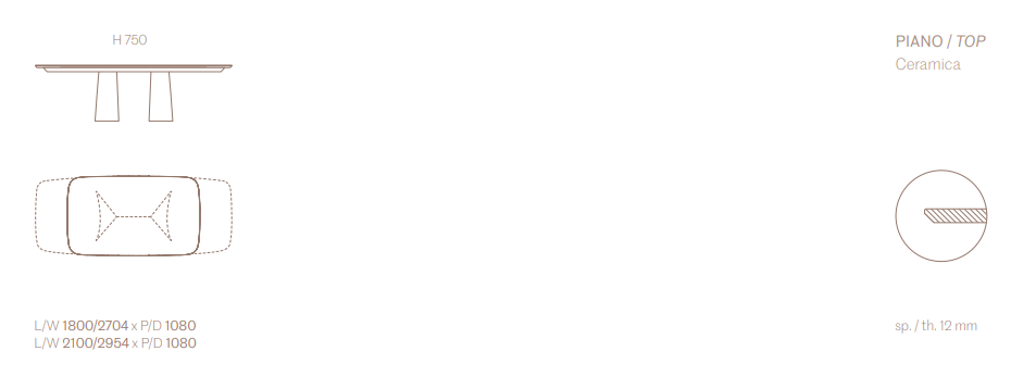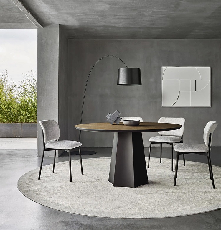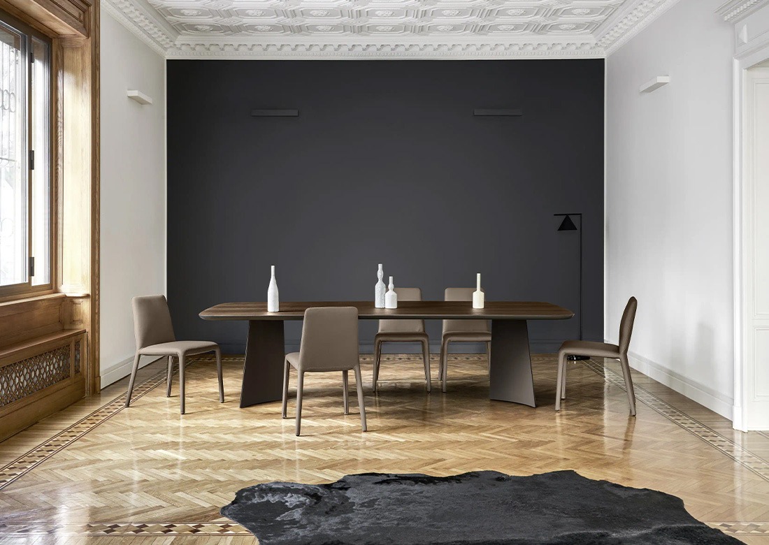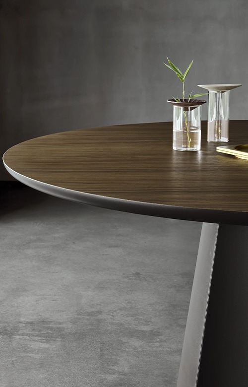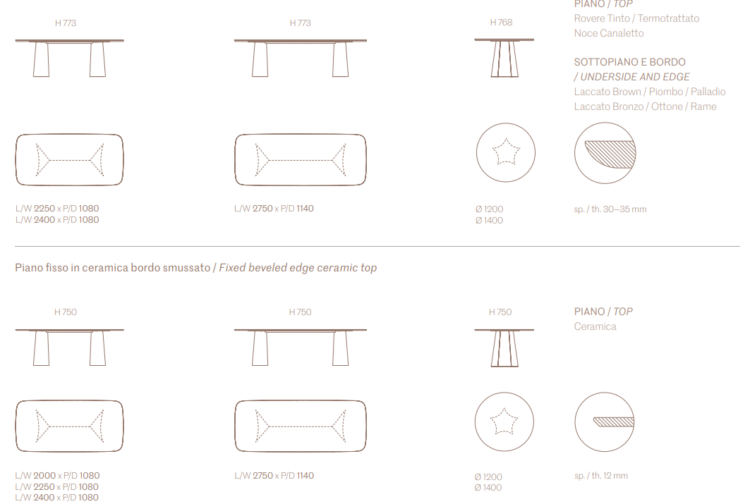 Многогранный стол имеет стальную подставку s235jr толщиной 1,5 мм, вырезанную лазером, изогнутую и собранную в три лепестка для каждой подставки прямоугольных столов и в пять лепестков для центральной подставки круглой модели, наконец, окрашенную. Доступен в фиксированном или расширяемом варианте, с деревянной столешницей толщиной 30 мм, закругленной или керамической со скошенным краем толщиной 12 мм.