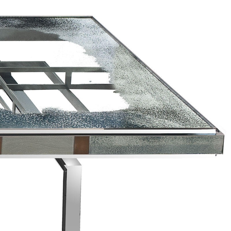 Конструкция выполнена из блестящей нержавеющей стали и деталей из античной бронзы.