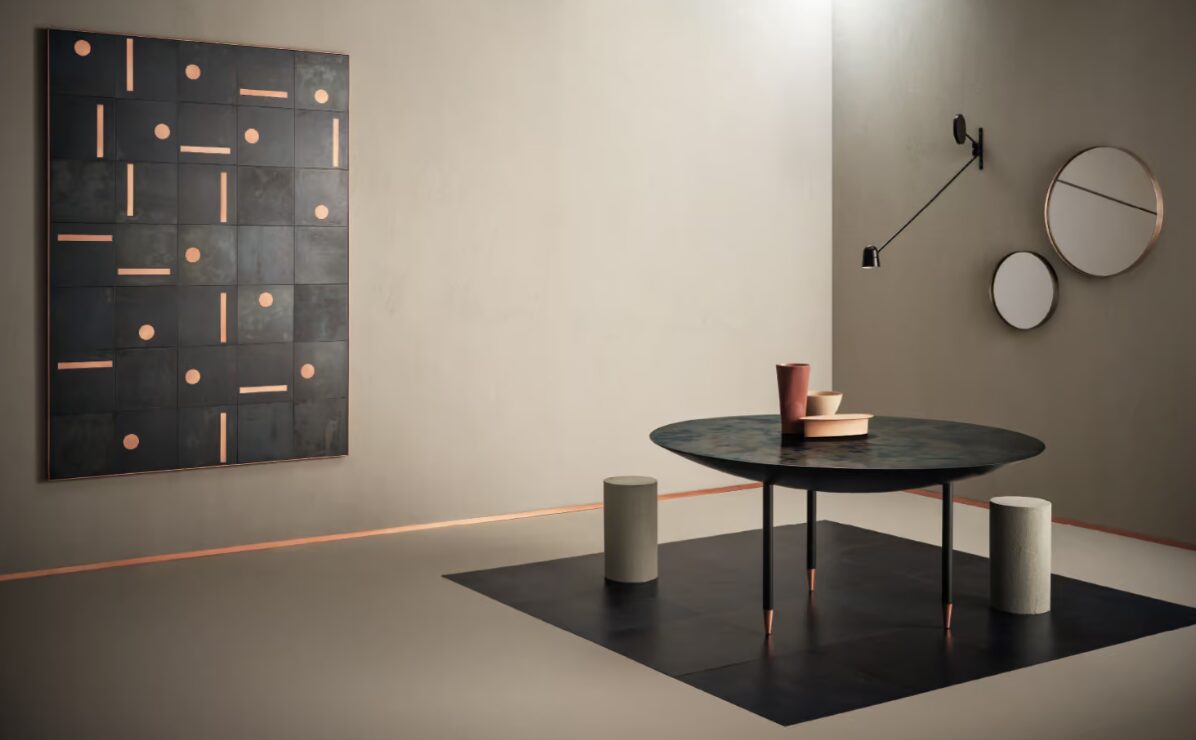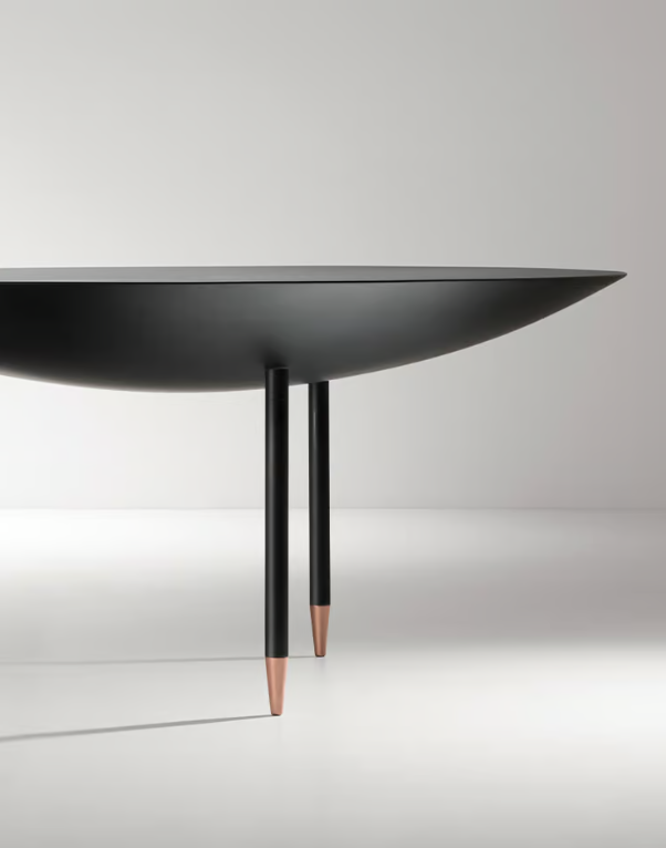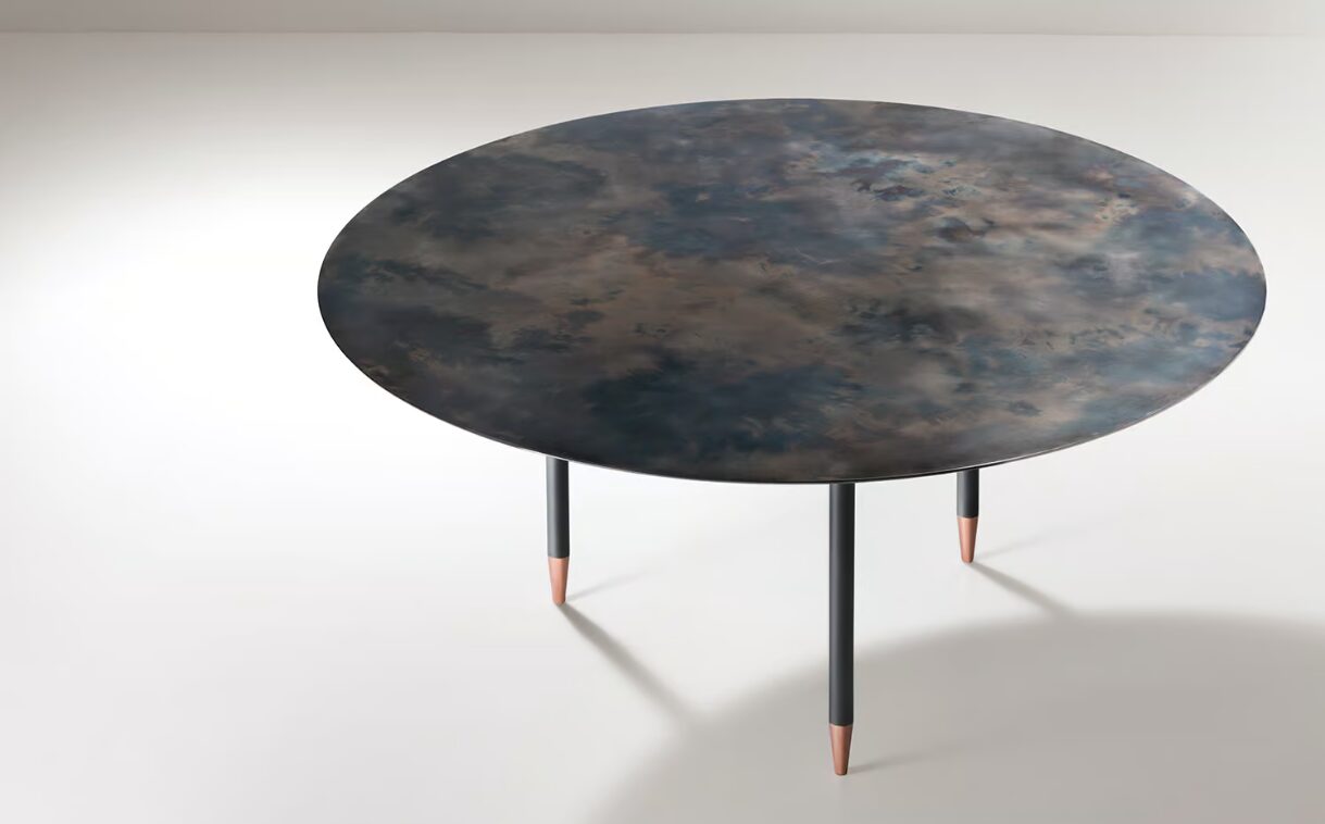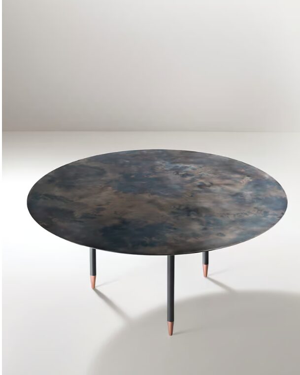 Индивидуальность этого скульптурного столика проявляется в переливающейся отделке столешницы, напоминающей о всегда тлеющих углях, и сиянии медных ножек, на которые опираются ножки, что облегчает наше восприятие целого.