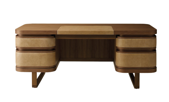 Основная конструкция : Еловая фанера, облицованная американским орехом. Декоративные рамки, передняя часть выдвижных ящиков и основание : Массив американского ореха. Заканчивать : Центральная панель выдвижных ящиков и боковые части обиты высококачественной кожей , доступной в различных цветах.
