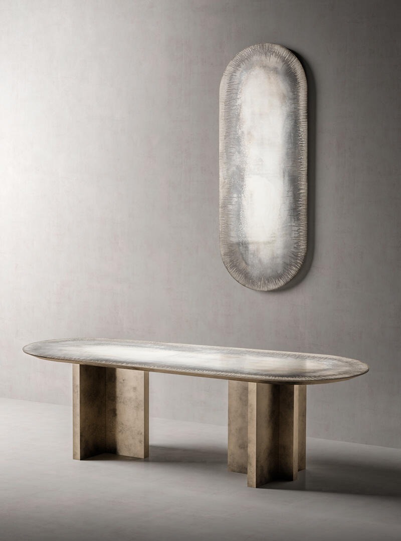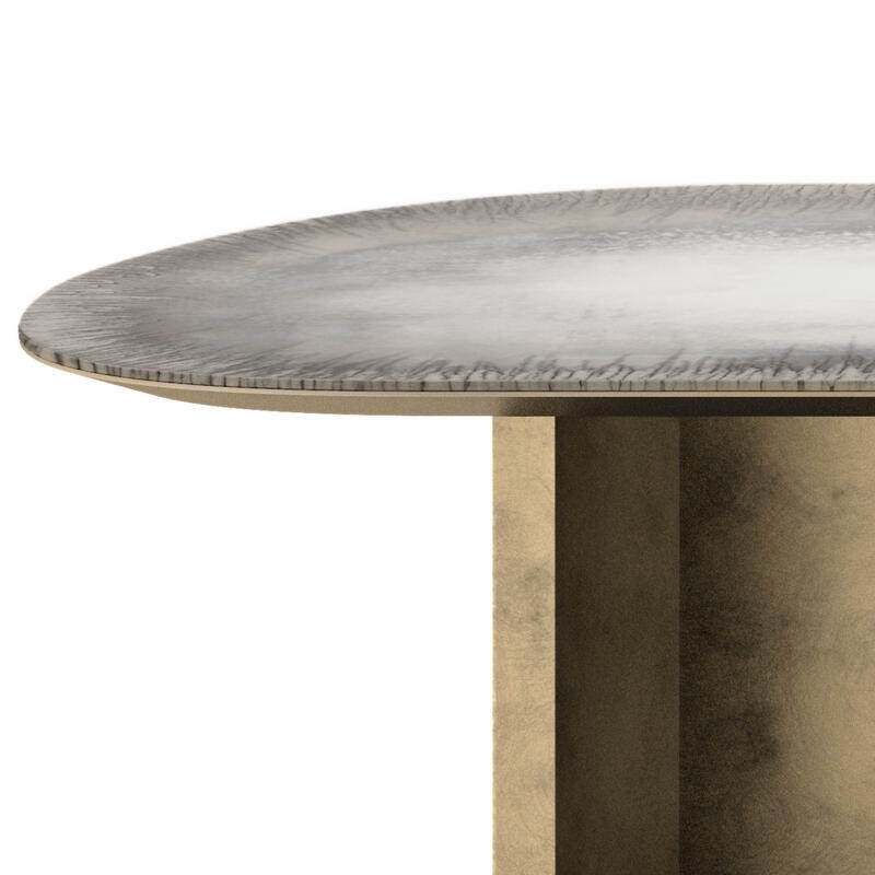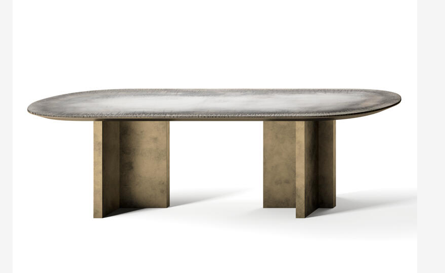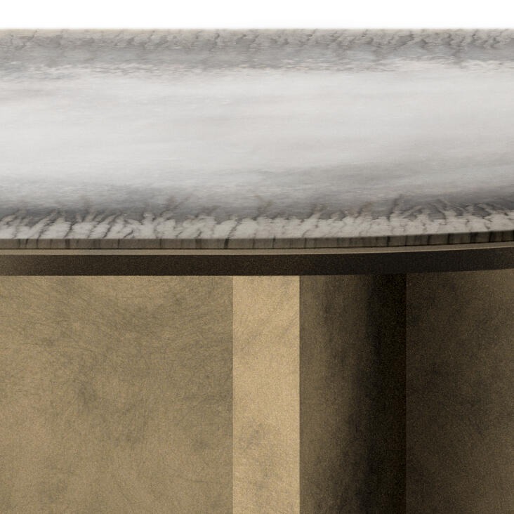 Каркас из фанеры, шпонированной МДФ. Каркас из дерева покрыт античной латунной краской, столешница из особо прозрачного стекла, протравленного кислотой, толщиной 10 мм.