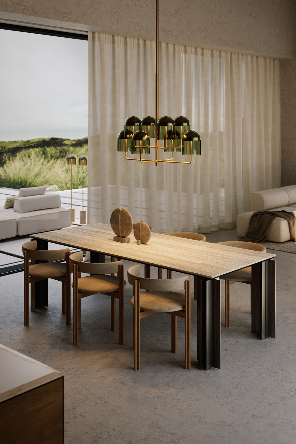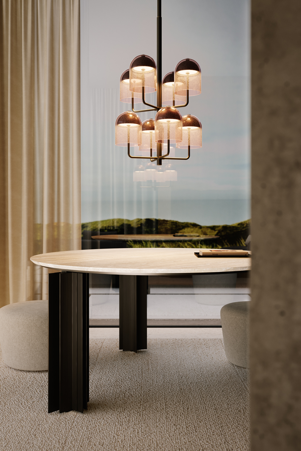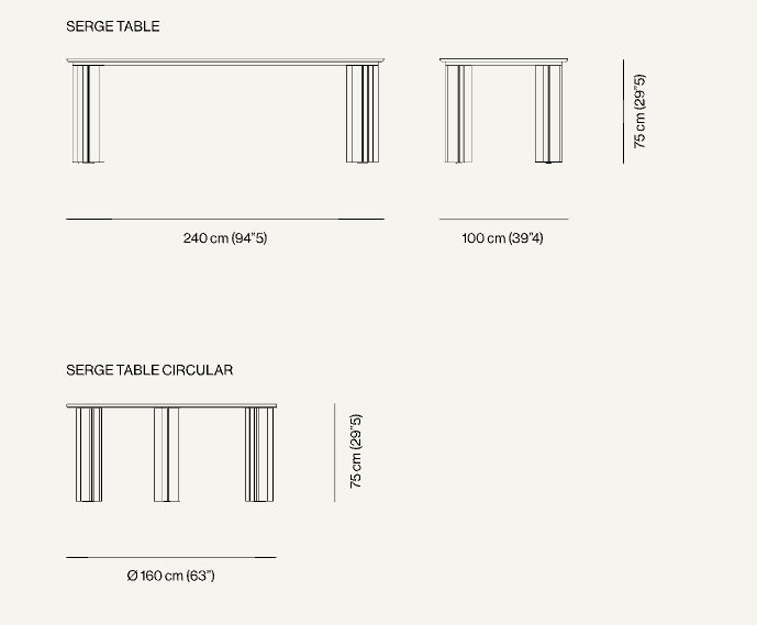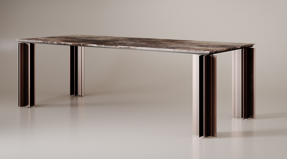 Внушительные ножки со строгими профилями создают трехмерные эффекты благодаря своим выступам и углублениям. Конструкция стола Serge из полированной меди или темной полосатой латуни и столешница из чиполлино ондулато россо или травертина из мрамора определяют его основные элементы, объединяясь в монументальную материальность, которая придает этому столу торжественность.