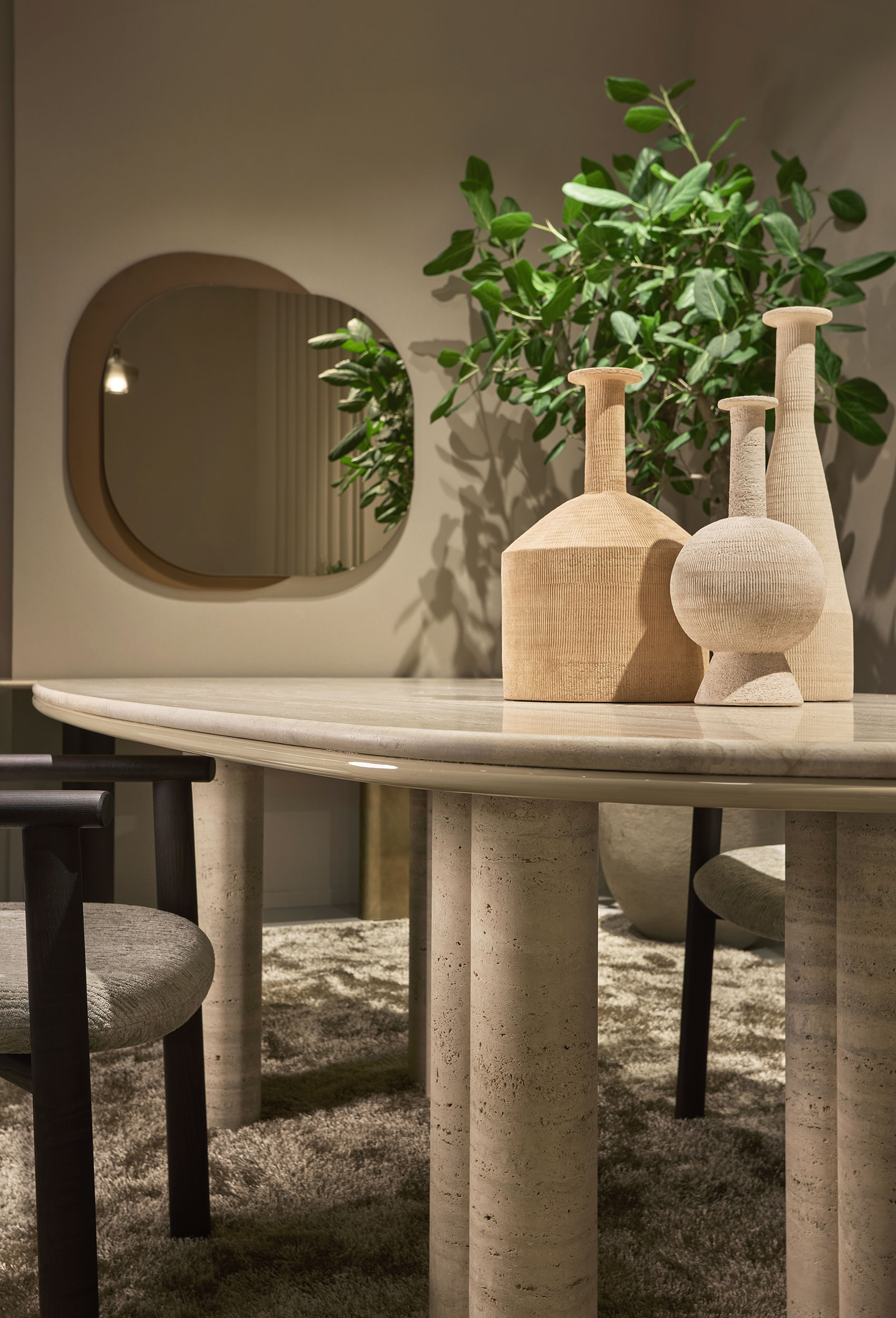 Коллекция Simmy Dining отличается скульптурной легкостью, несмотря на монументальность мраморных конструкций. Ее органичные линии и плавные изгибы создают ощущение воздушности, превращая стол в произведение современного искусства. Доступные формы столешницы — прямоугольная, квадратная или круглая — позволяют идеально вписать мебель в любое пространство, будь то просторная столовая или уютная кухня-гостиная.