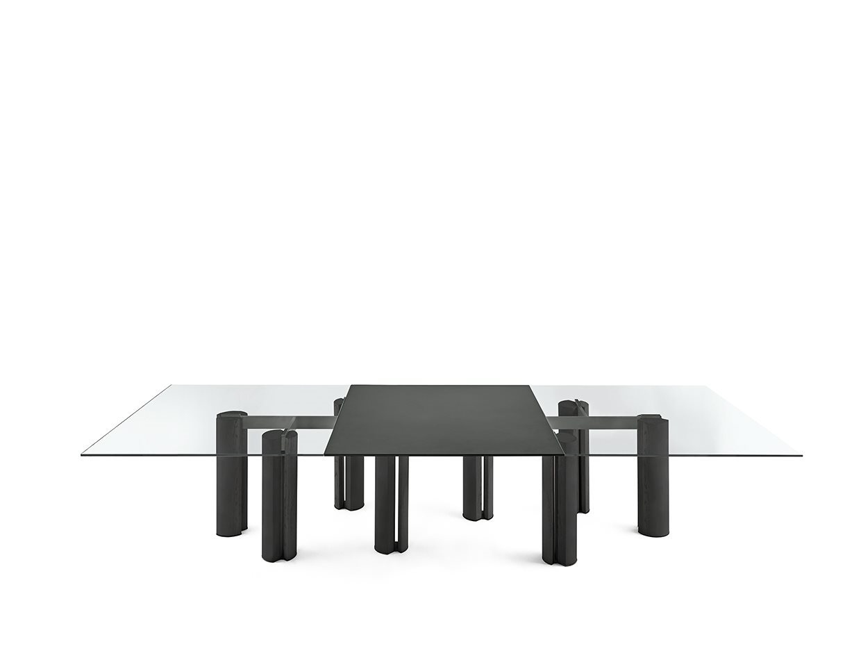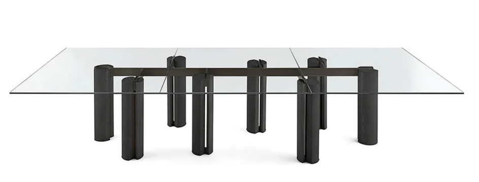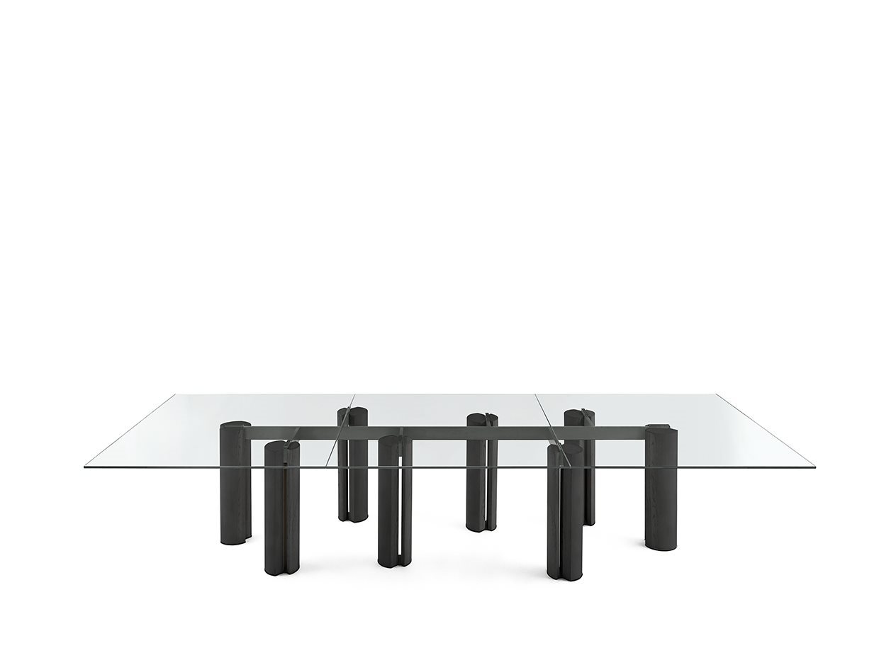 Стол с закаленным хрустальным верхом 12 мм, доступный в extralight, «серый Италия» или окрашенный в эксклюзивную античную бронзу или свинцовую отделку. Основания из массива ясеня, окрашенного в черный цвет, с открытыми порами. Металлические детали из лакированного металла цвета «Бронза».
