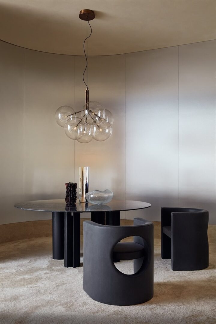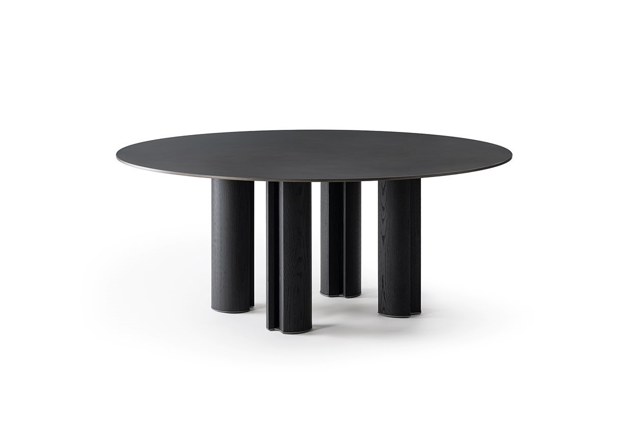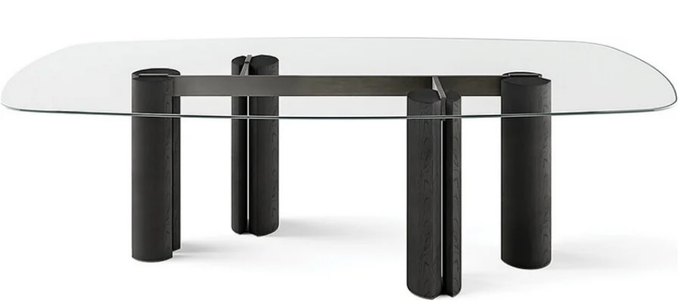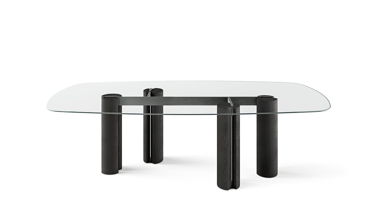 Стол с хрустальной столешницей 12 мм, закаленный extralight или «серый Италия». Также доступна версия из кристалла, окрашенного в эксклюзивную античную бронзу и свинцовую отделку, или из матового полированного мрамора Nero Marquinia 20 мм. основания из массива ясеня, окрашенного в черный цвет, с открытыми порами. Металлические детали из лакированного металла цвета «Бронза».