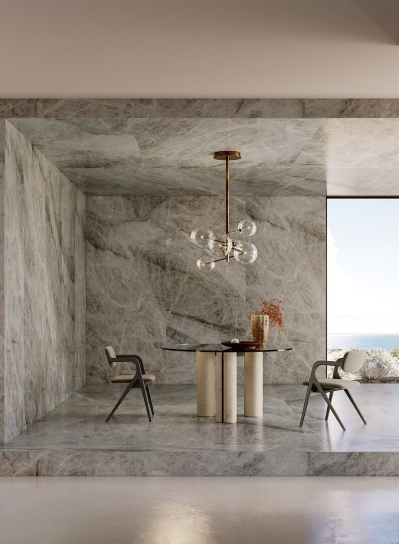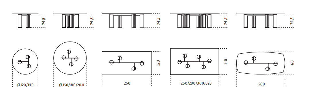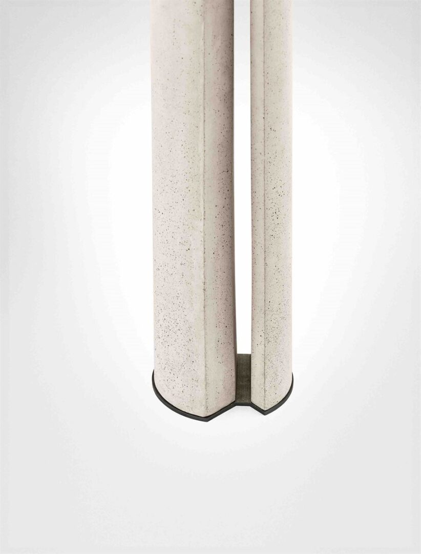 Стол с закаленным хрустальным верхом 12 мм, доступный в extralight. Также доступна хрустальная версия, окрашенная в эксклюзивную отделку из античной бронзы и свинца. Основания из светлого бетона цвета слоновой кости или древесного угля. Металлические детали из лакированного металла цвета «Бронза».