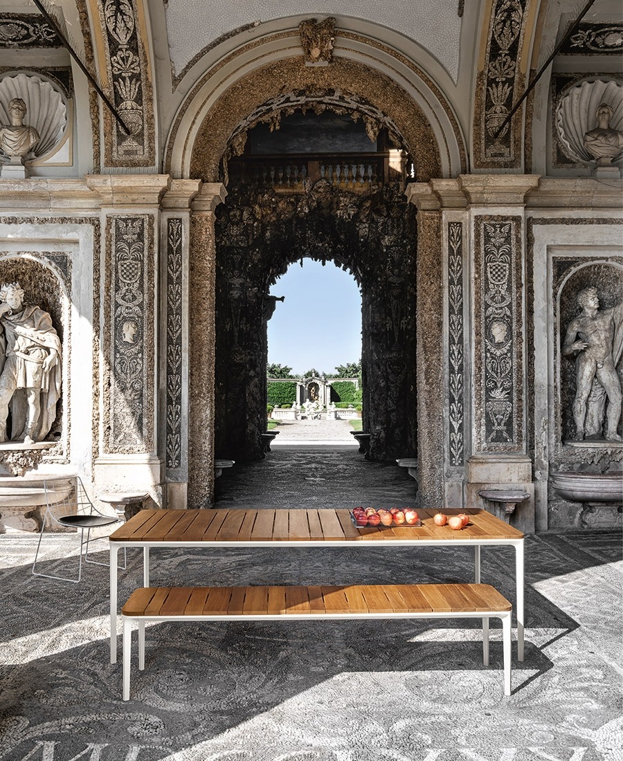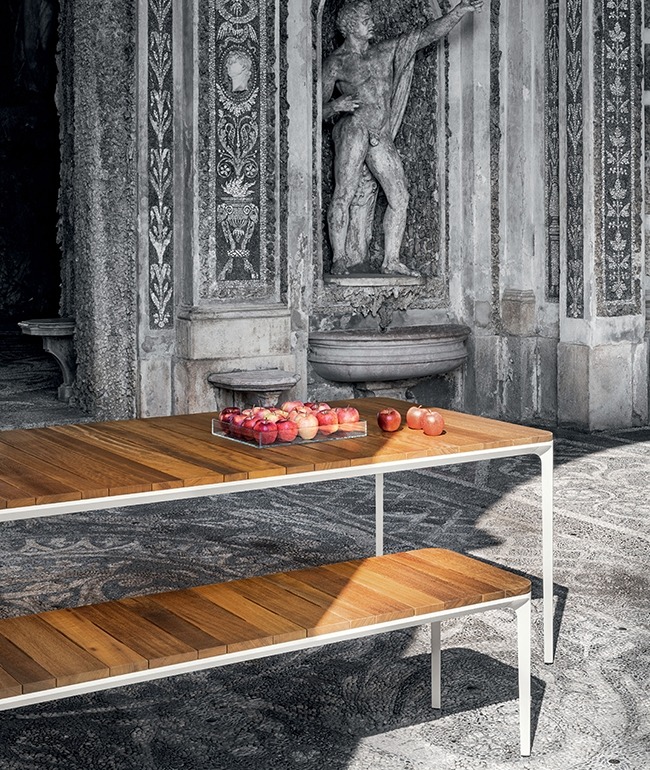 Универсальная коллекция столов, журнальных столиков, консолей и скамеек для наружного пространства, признанная своим дизайном и технологией, представляет новый способ интерпретации уличной мебели, делая ее отличительной и функциональной благодаря эстетическому минимализму и изысканной отделке, предлагаемой в диапазоне от дерева ироко до керамики.