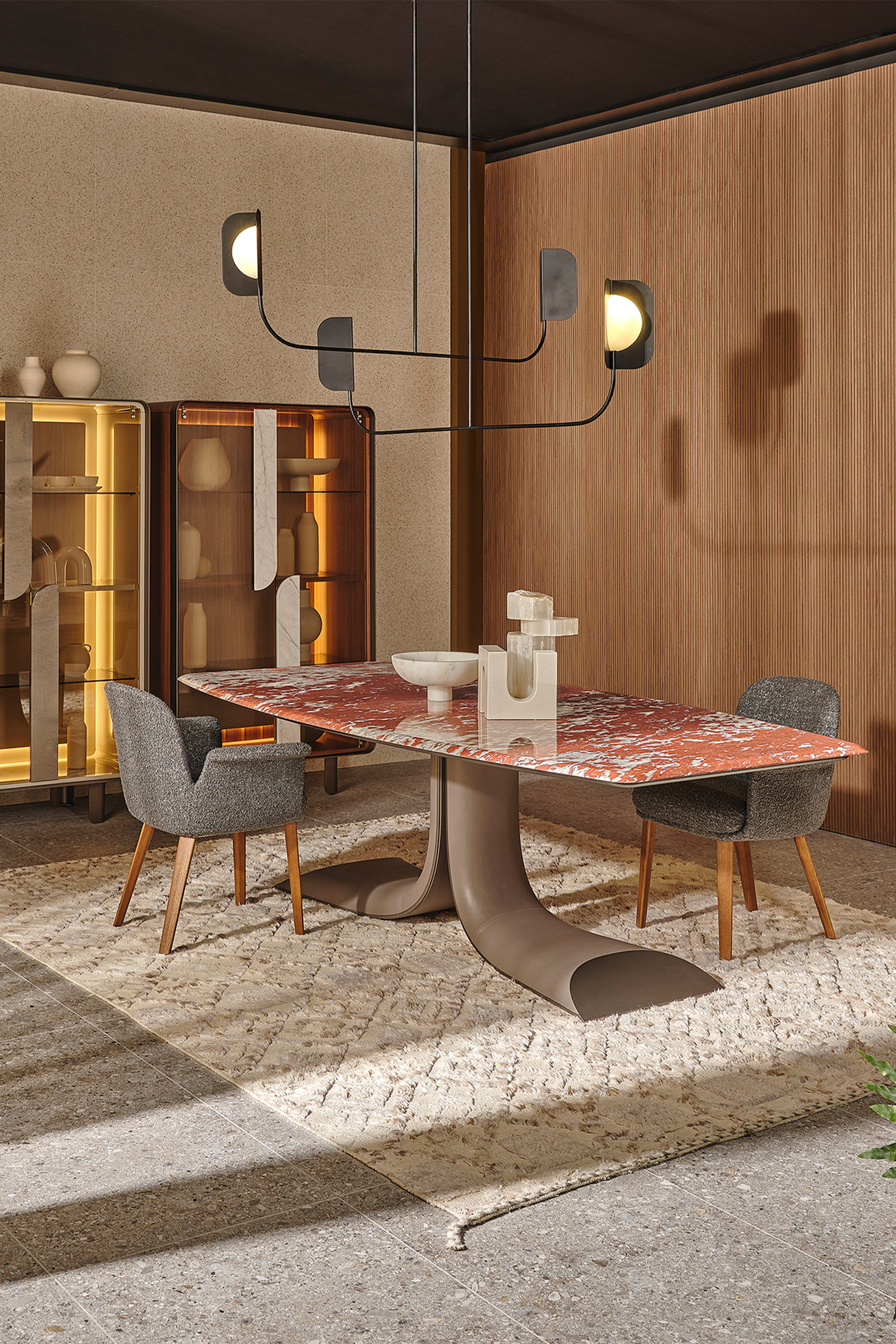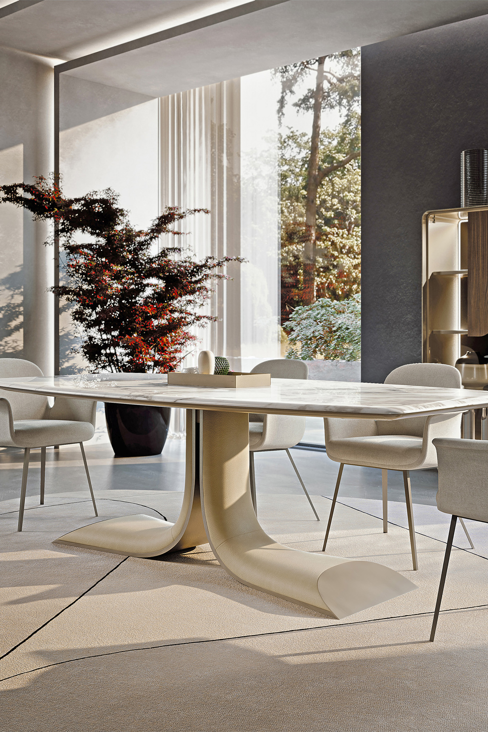 Коллекция Soul получила свое название неслучайно — в каждом элементе этой мебели чувствуется душа, воплощенная в плавных изгибах и продуманных пропорциях. Центральная ножка стола, обтянутая мягкой кожей, изгибается с грацией танцора, создавая эффект динамики и легкости. Ее форма сужается кверху, подчеркивая изящество конструкции, а небольшое расширение у основания добавляет устойчивости и завершенности композиции.