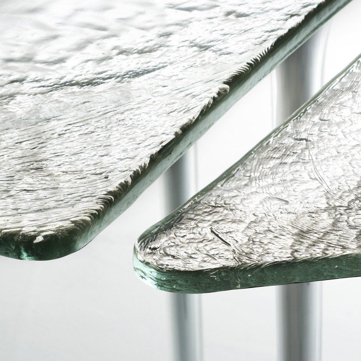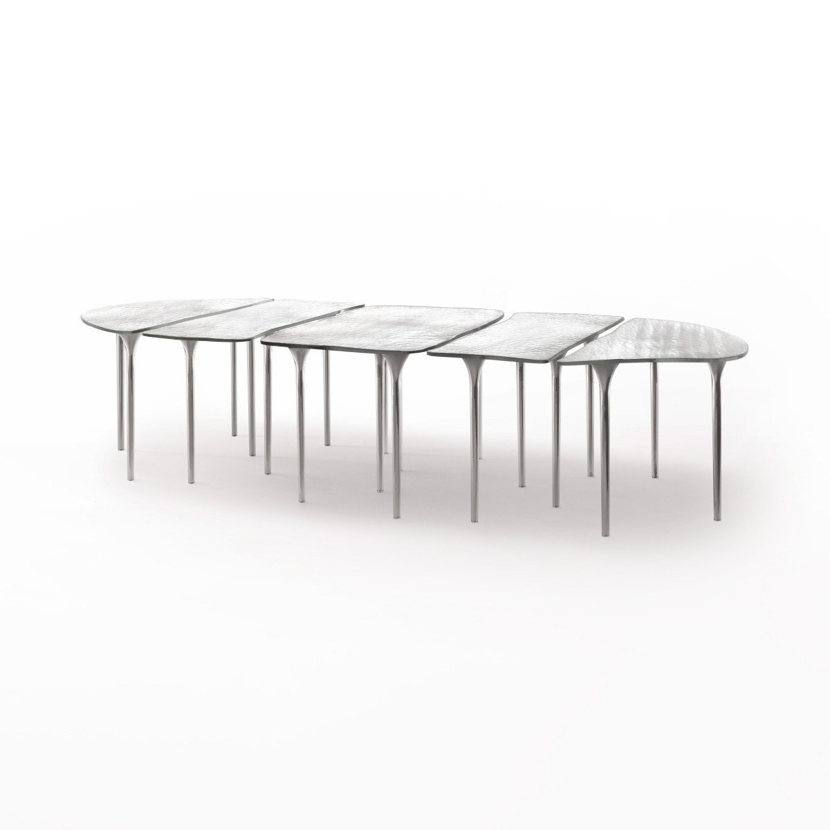 Коллекция высоких столов и столиков, закругленными краями и элегантными тонкими ножками из выдувного стекла. Различные элементы, доступные независимо друг от друга, при близком расположении друг к другу, могут создать стол больших размеров. Столешницы выполнены из специального литого посеребренного стекла. Ножки всегда имеют одинаковую отделку верха.