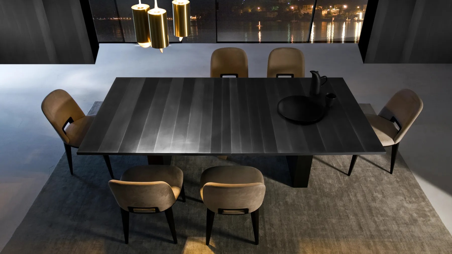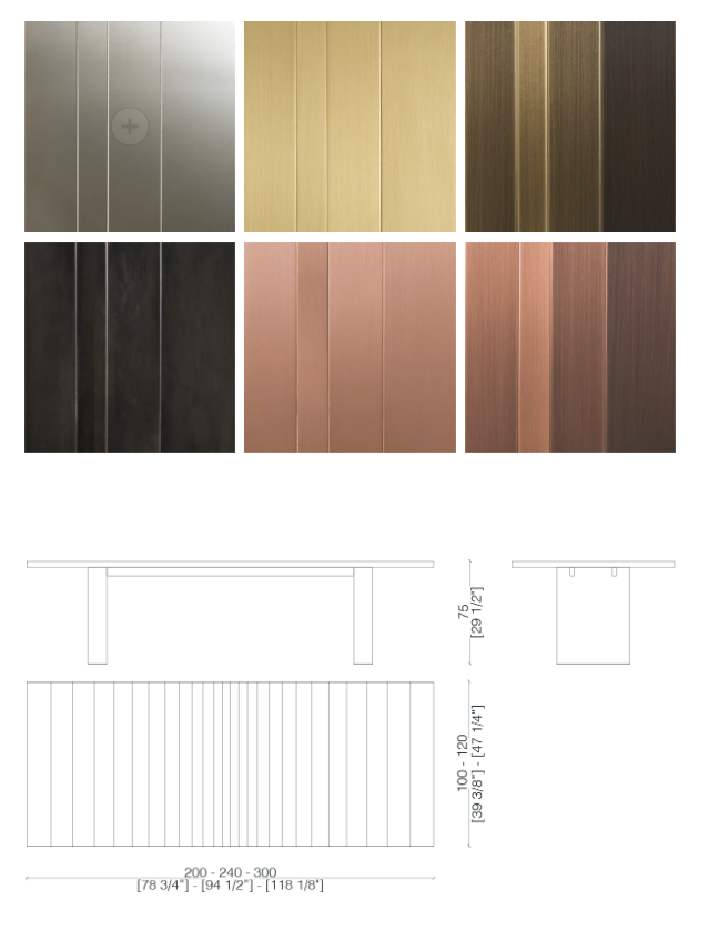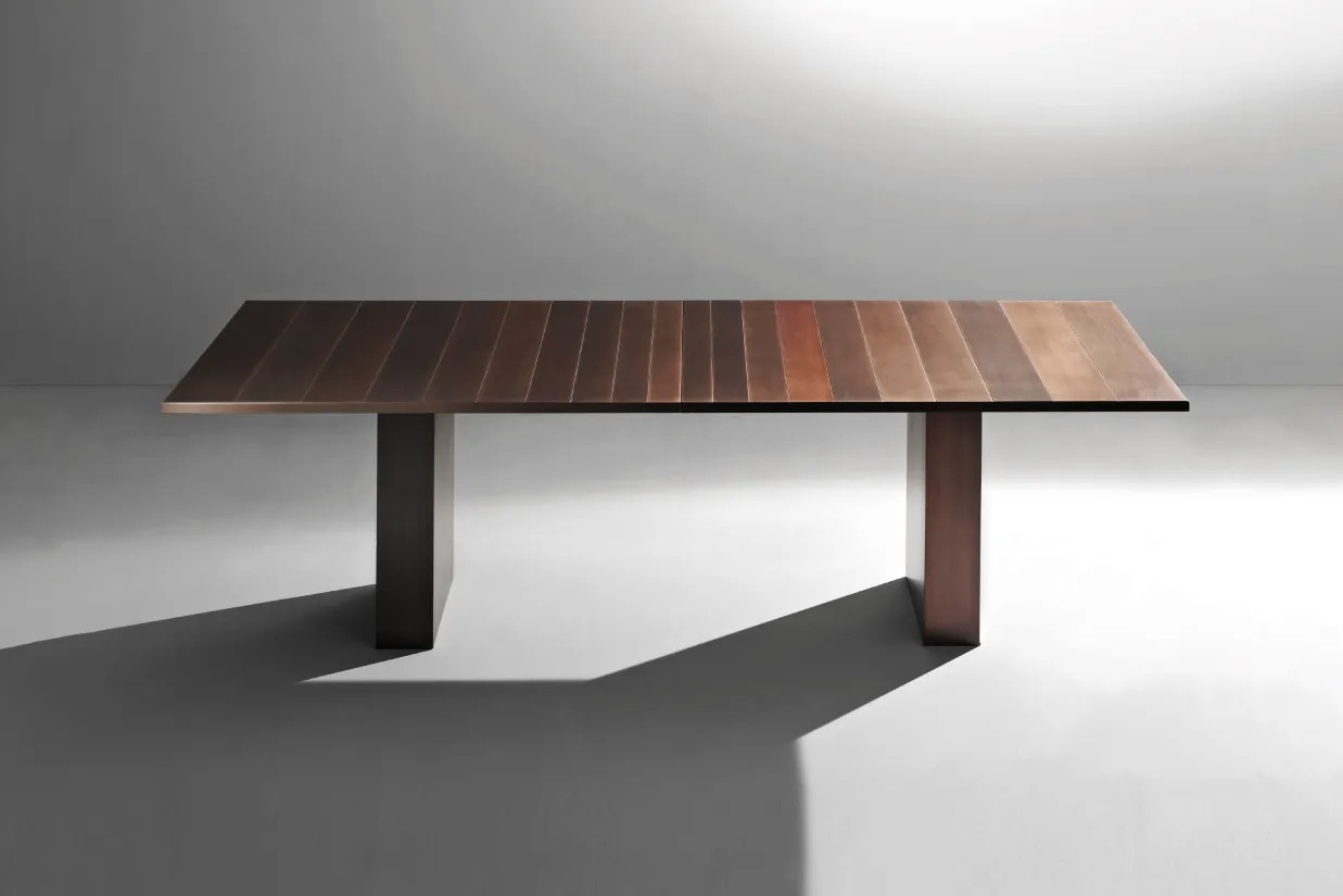 Стол с поверхностью, полностью декорированной комбинацией из металлических полос, доступный в трех размерах.