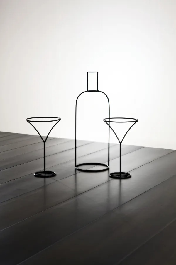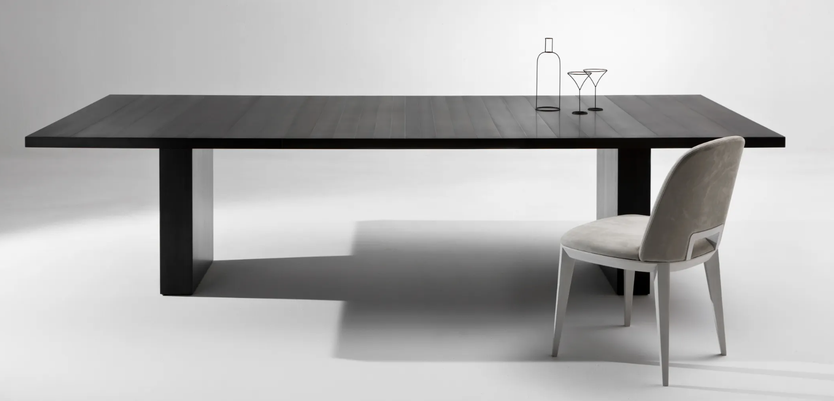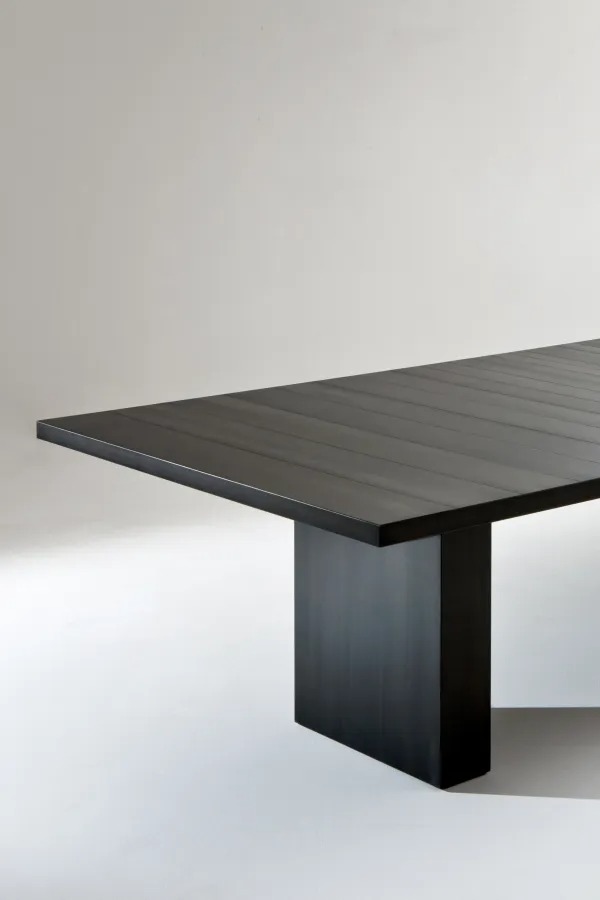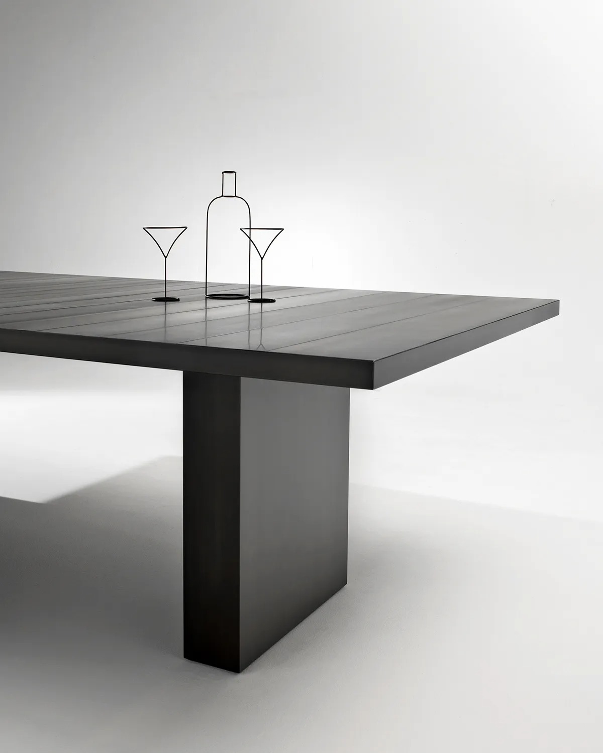 Стол с поверхностью, полностью декорированной комбинацией из металлических полос, доступный в трех размерах.
