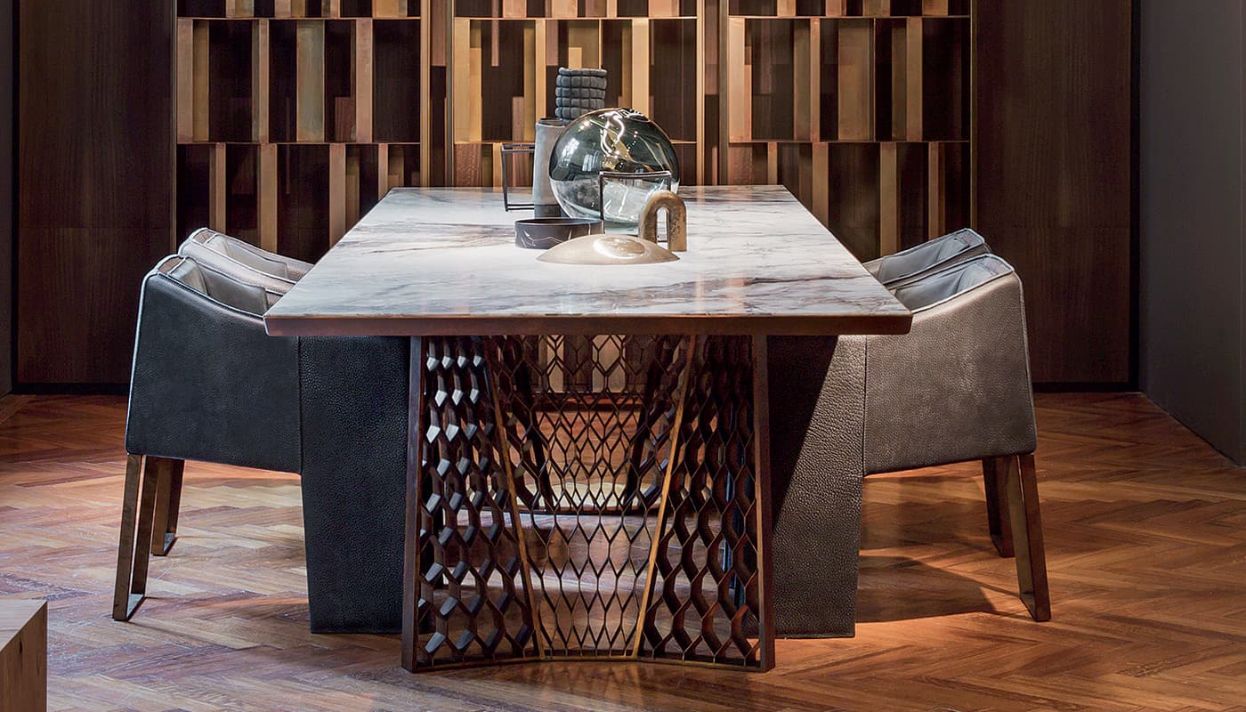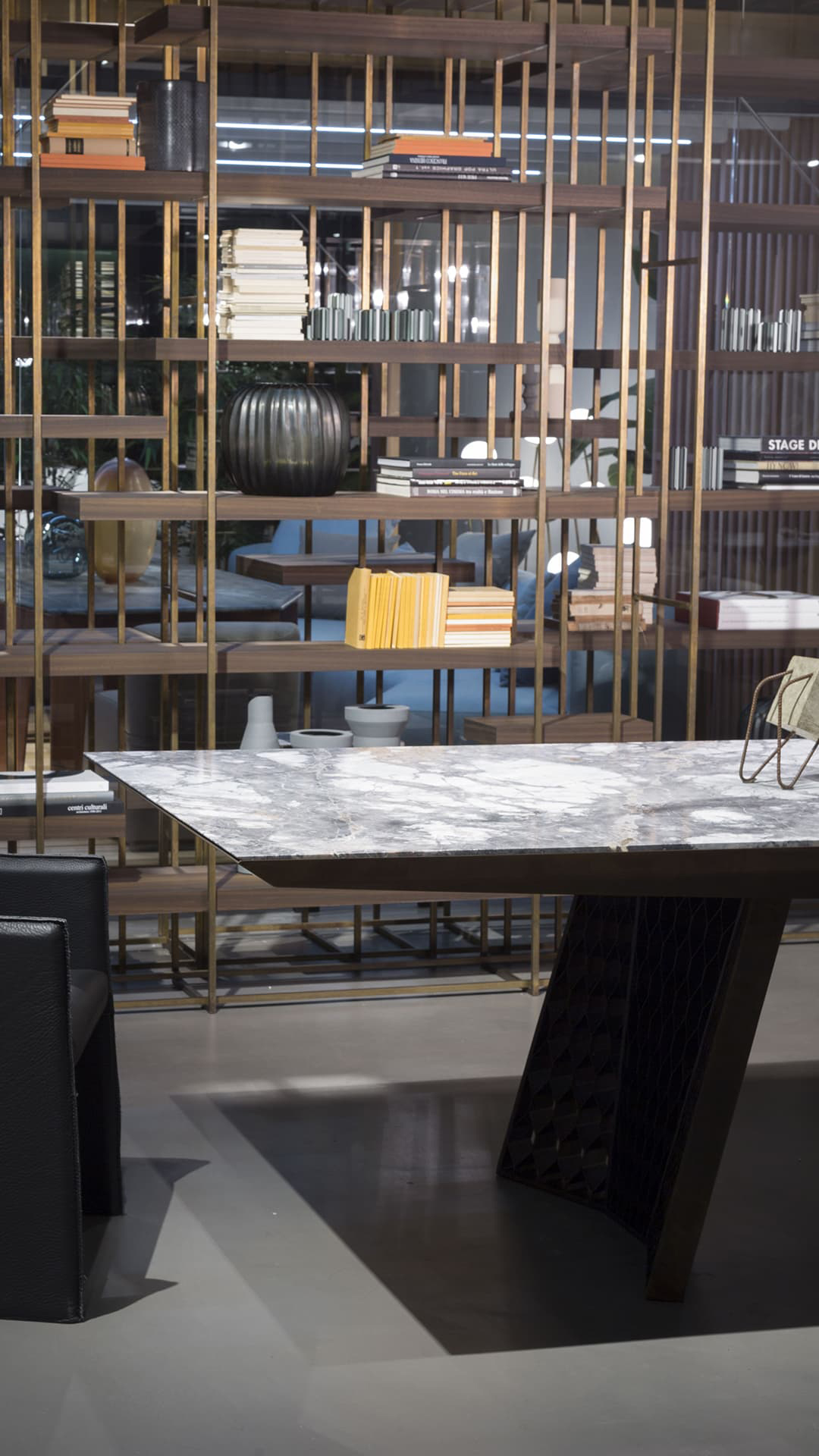 Ретро-модернистский дизайн, исследованный в новаторских авангардных терминах, характеризует особую индивидуальность стола Stealth, динамичную и элегантную конфигурацию, созданную сочетанием большой каменной или деревянной столешницы прямоугольной формы и легкости искусно обработанных металлических ножек с сотовым узором.