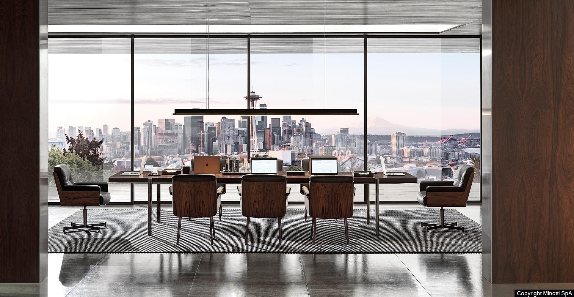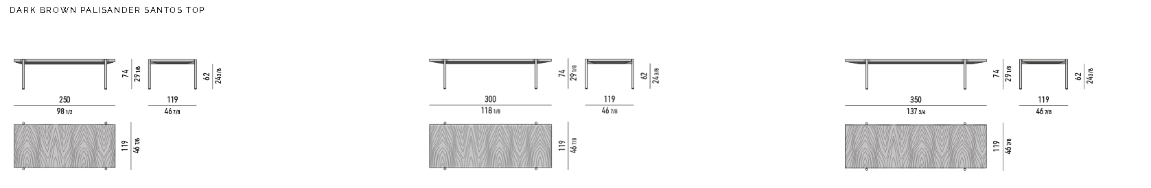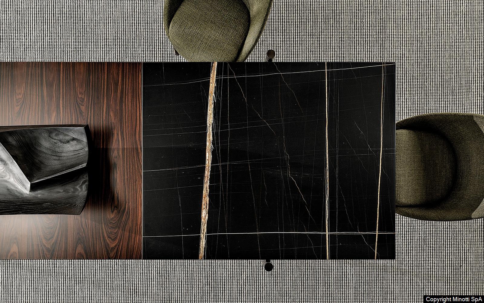 Доступен в четырех размерах (от 250 до 400 см) и нескольких вариантах отделки: темный палисандр Santos с матовым покрытием, черный лакированный ясень или комбинация палисандра с мрамором Sahara Noir. Итальянское качество MINOTTI гарантирует долговечность и безупречный внешний вид.
