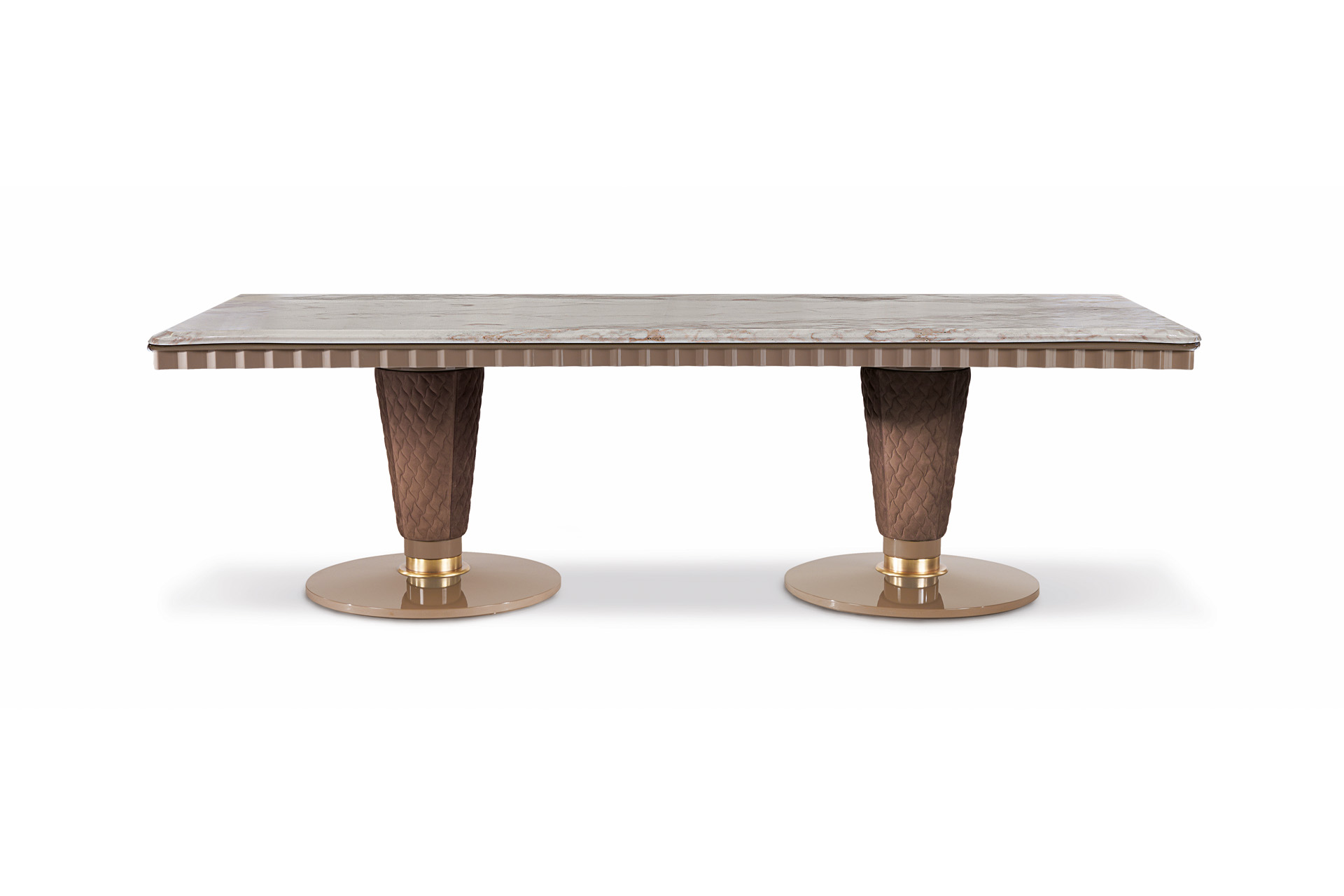Элегантный обеденный стол в современном стиле с вышитыми кожаными вставками и мраморной столешницей доступен в версиях T/5100-550 см. 550x150x78 ч. И Т / 5100-260 см. 260x127x78 ч.