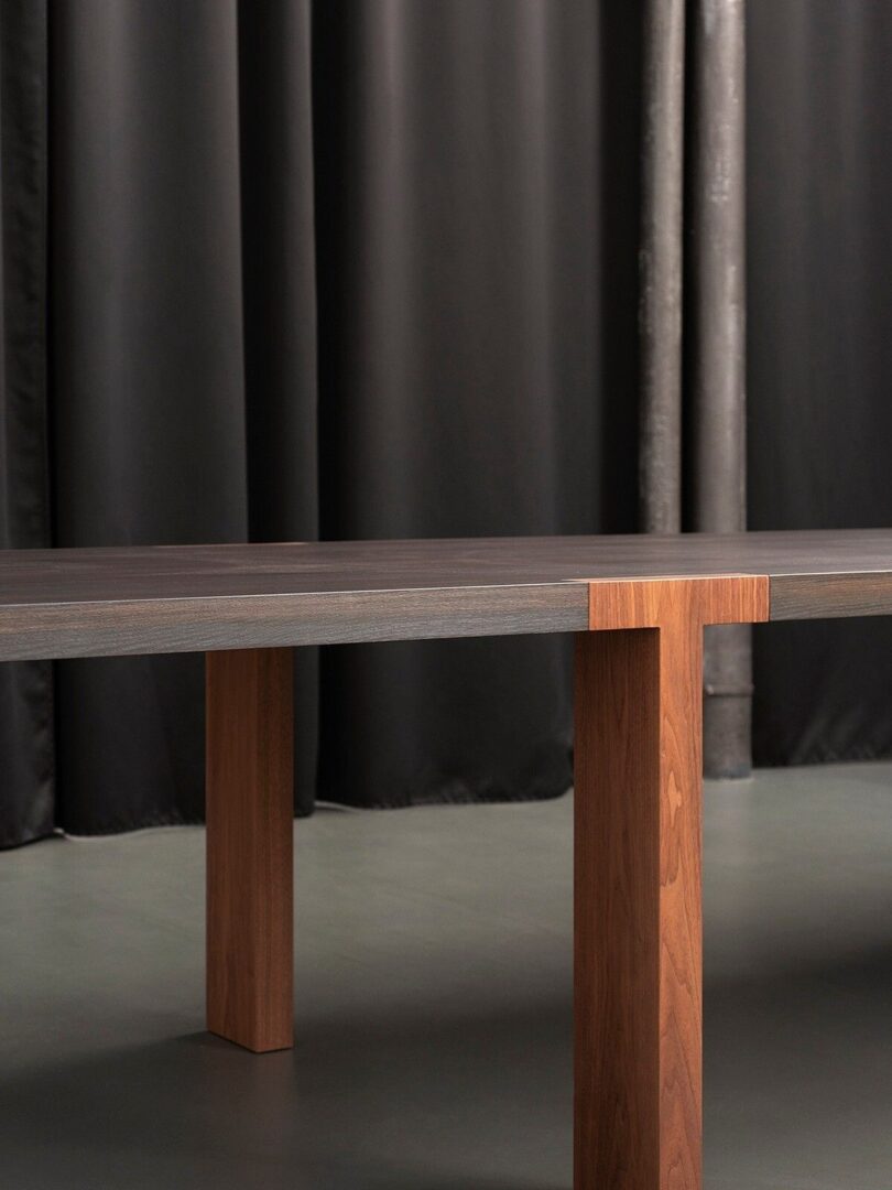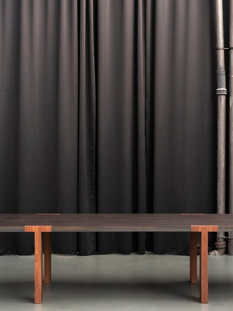 В Т-образном столе два простых элемента умело вставляются друг в друга благодаря продуманному до мельчайших деталей соединению, которое соединяет столешницу и ножки стола, обеспечивая максимальную устойчивость.