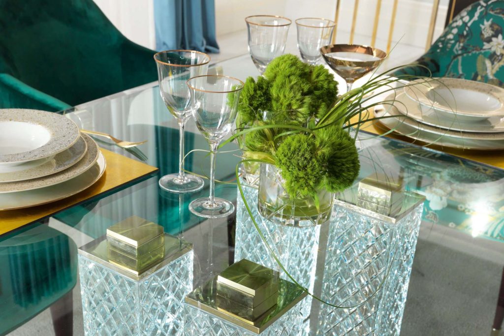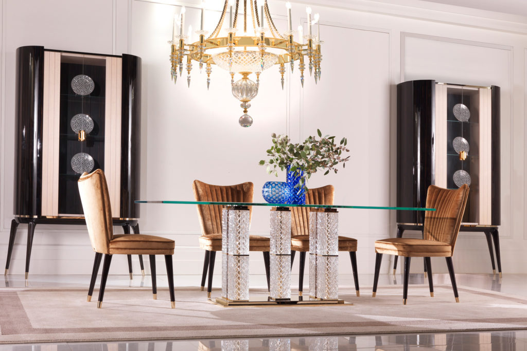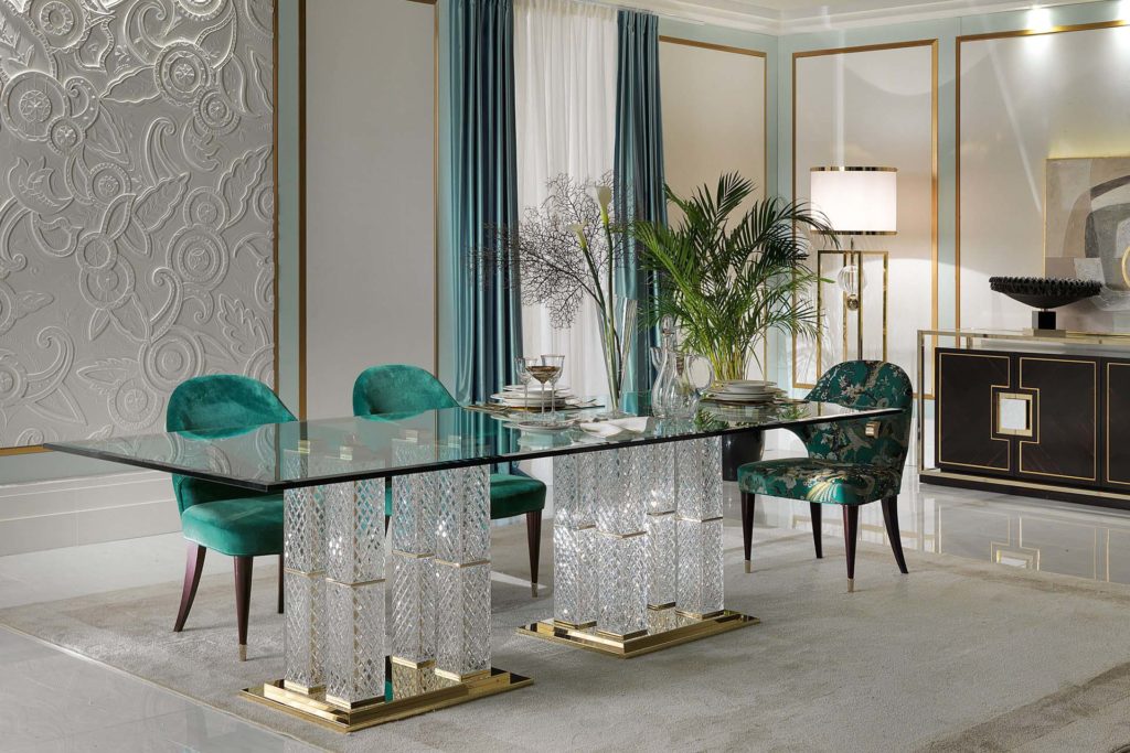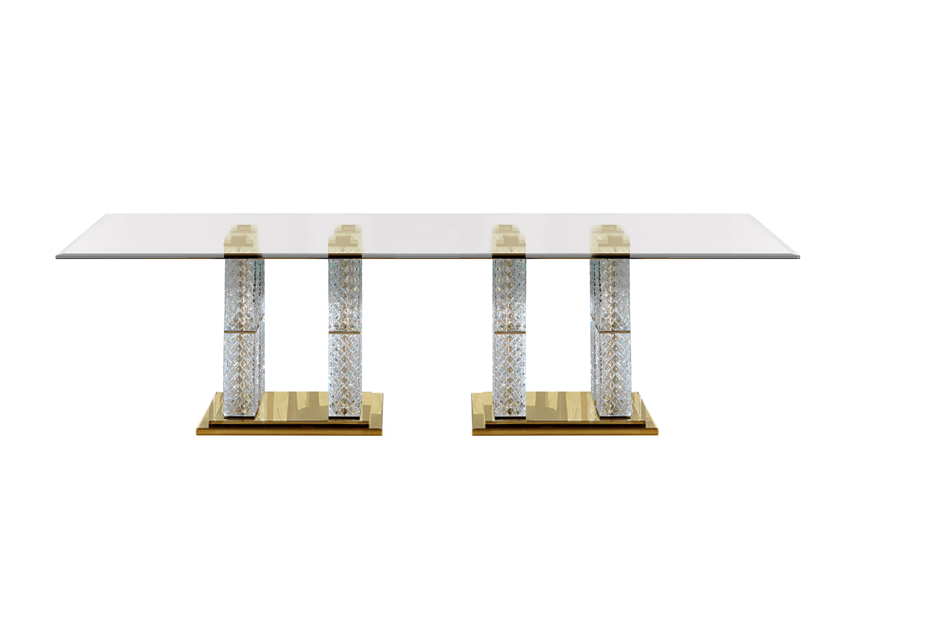 Великолепный обеденный стол со стеклянной столешницей, точеными вручную хрустальными основаниями и золотой отделкой ванной комнаты. Тонко обработанная нижняя часть представляет собой безошибочную особенность этой коллекции, сочетающую простые линии с отделкой высокого качества ручной работы.