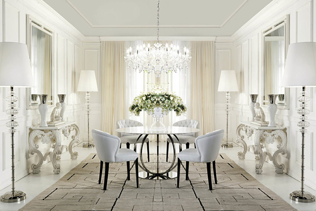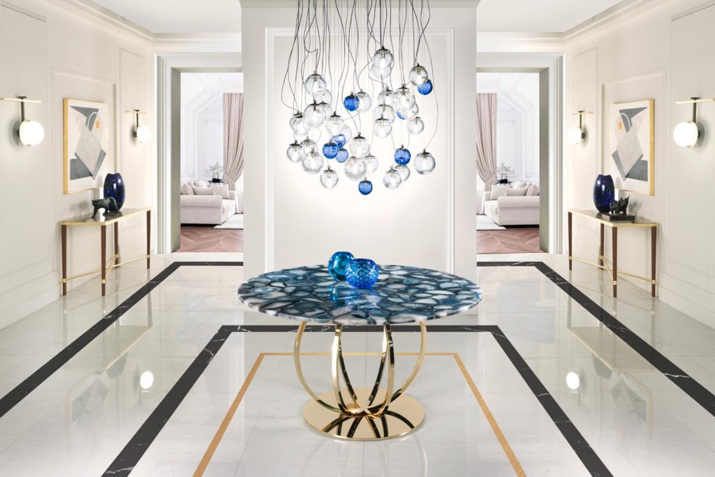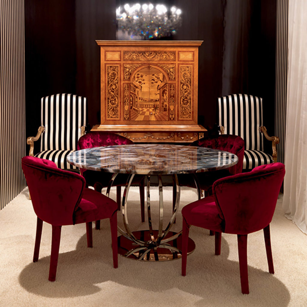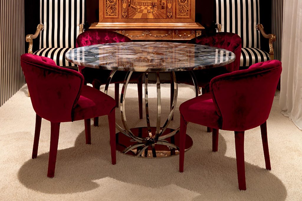 Обеденный стол в современном стиле доступен в версии T78 / G с хромированной отделкой и мраморной столешницей и в версии T78 / G-AGHATA с серой столешницей из полудрагоценного камня Aghata