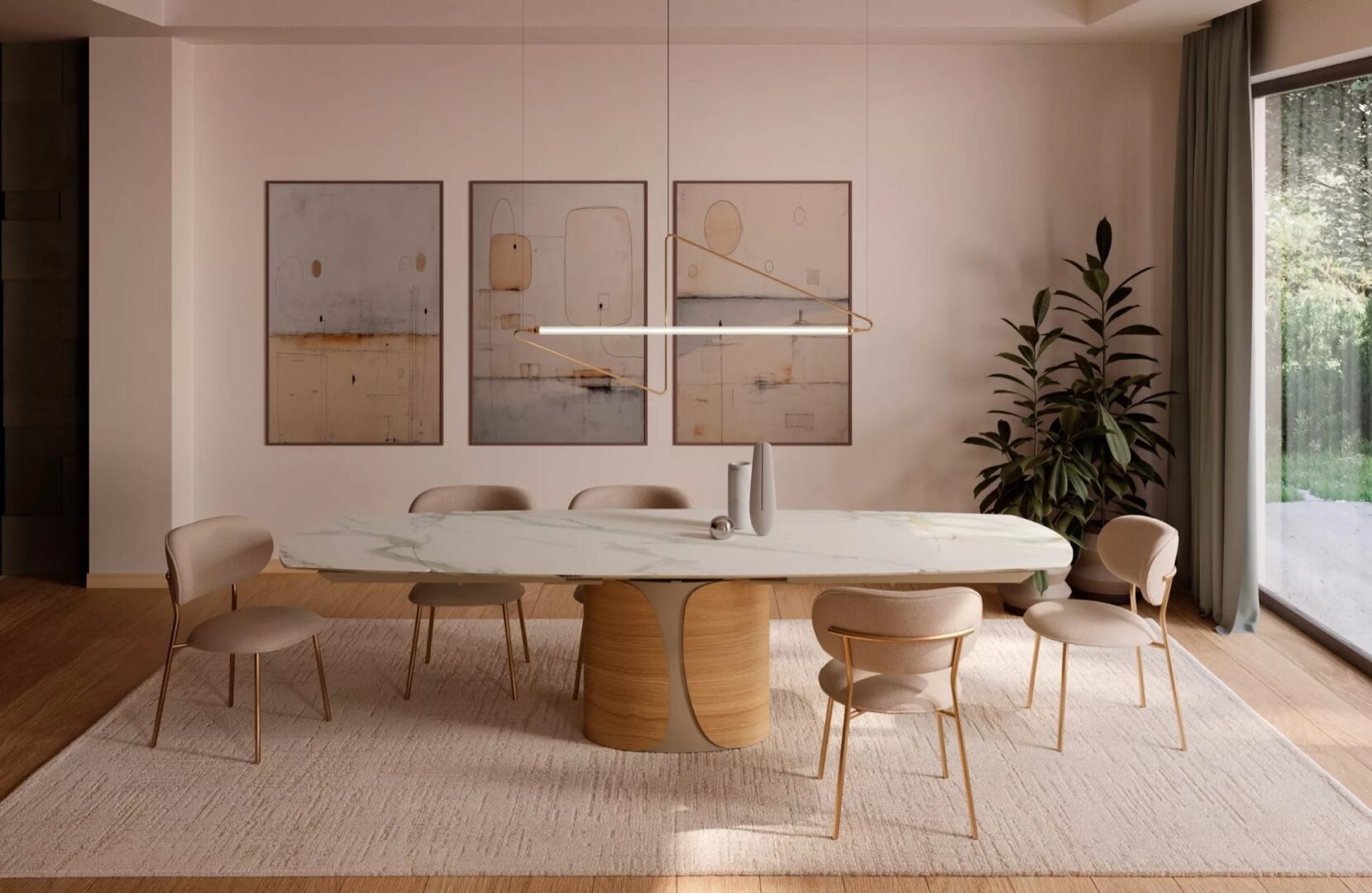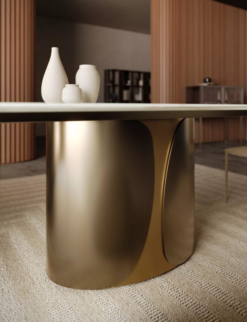 Talos — это стол, который заявляет о себе с прочной элегантностью и архитектурным присутствием. Отличительная особенность — монолитное эллиптическое основание, состоящее из двух симметричных оболочек, обнимающих центральную часть. В металлическом варианте основание выделяется изысканными цветовыми сочетаниями, создающими визуальные вибрации или утончённые эффекты тон в тон. В сочетании металла и дерева тёплая фактура древесины сочетается с блеском металлических покрытий, создавая гармоничный баланс между материальностью и строгостью. В любом исполнении Talos сохраняет свою сценографическую идентичность и главенствующую роль, определяя пространство с харизмой.
