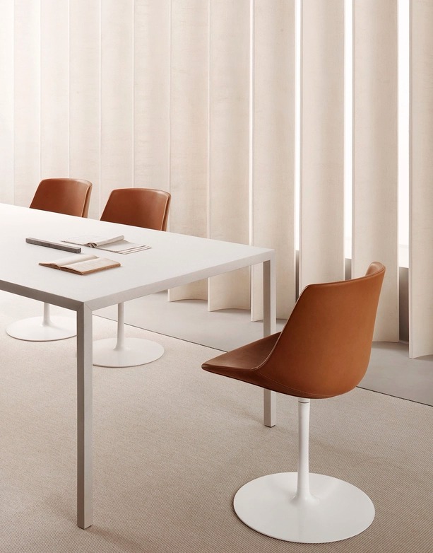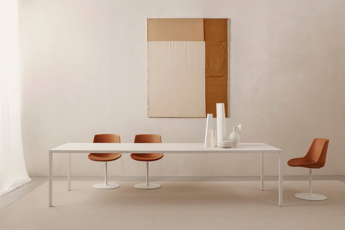 Материал Tense Stone сочетает в себе фирменную легкость коллекции Tense с аутентичным характером отделки из восстановленного камня. Ручное нанесение минеральной смеси мрамора и кварца по всей поверхности придает эксклюзивность столам, разработанным Пьерджорджио и Микеле Каззанигой. Их минималистичный дизайн и элегантный силуэт делают их подходящими для любой обстановки и любого стиля, от классического до современного.