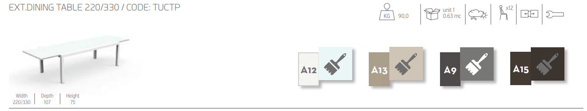 Выдвижной обеденный стол может удлиняться на 330 сантиметров и вмещать за собой до 12 человек. Алюминиевая конструкция и стеклянная столешница.