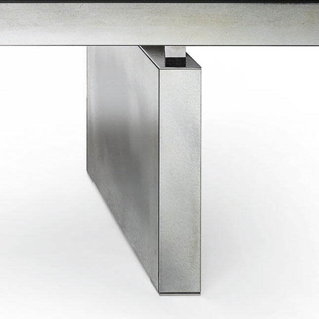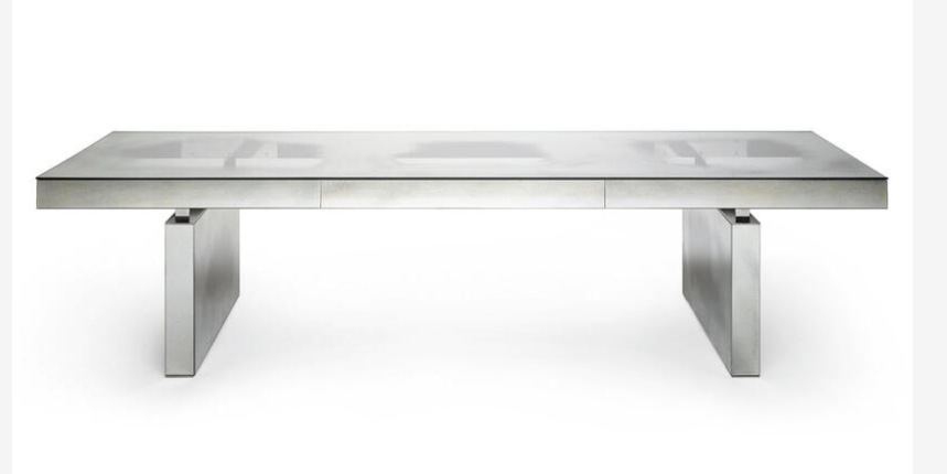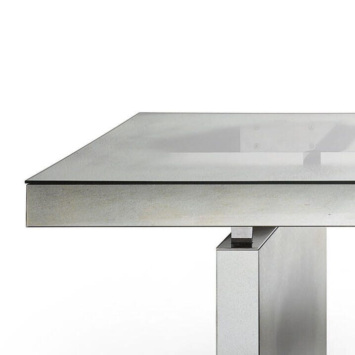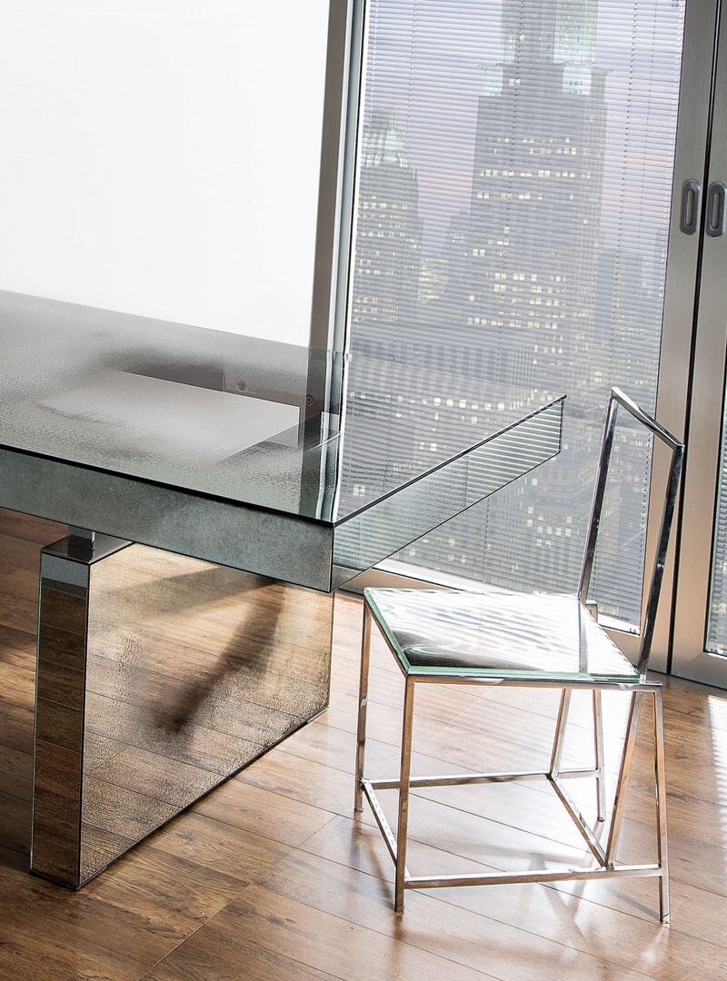 Стеклянный столик, частично отделанный старинным зеркалом в стиле “Лагуна”. Конструкция из шпонированного дерева, отделанного дубом, с блестящими деталями из нержавеющей стали.