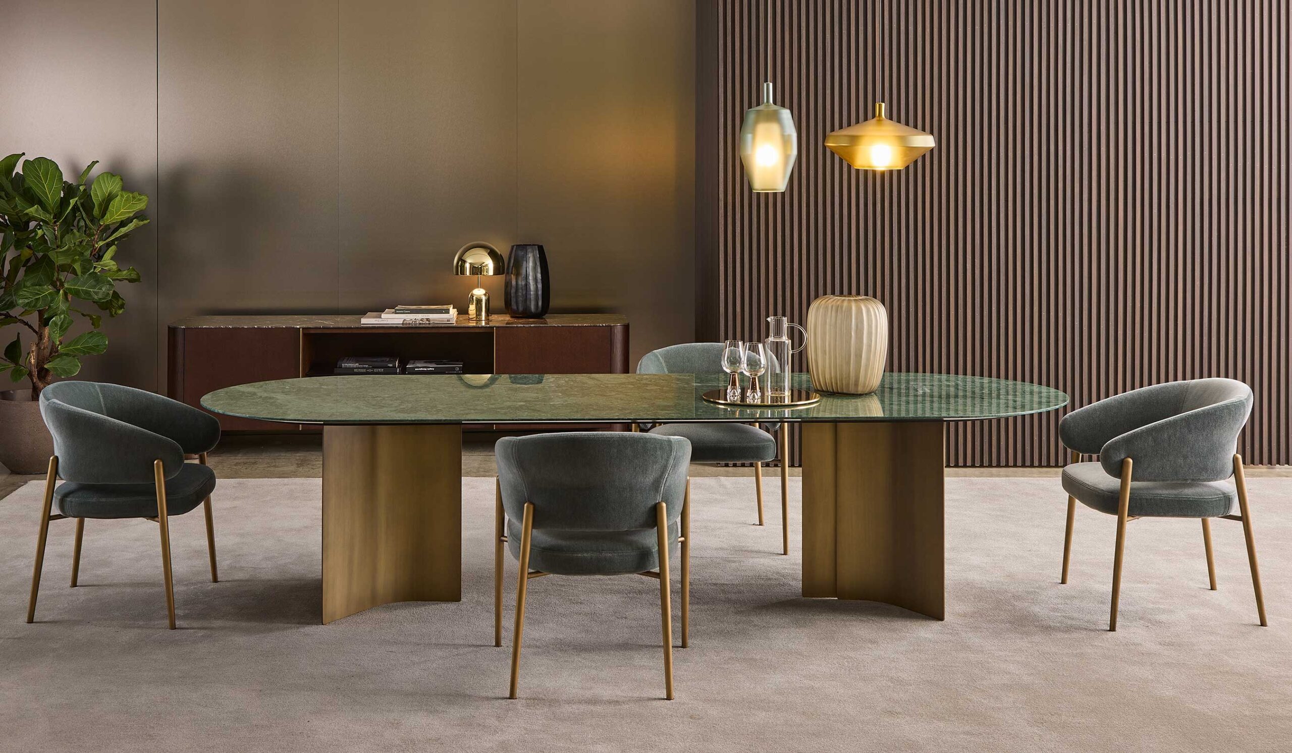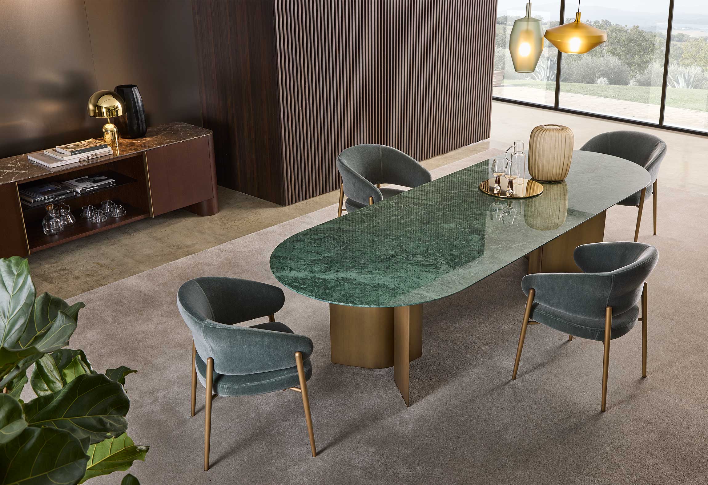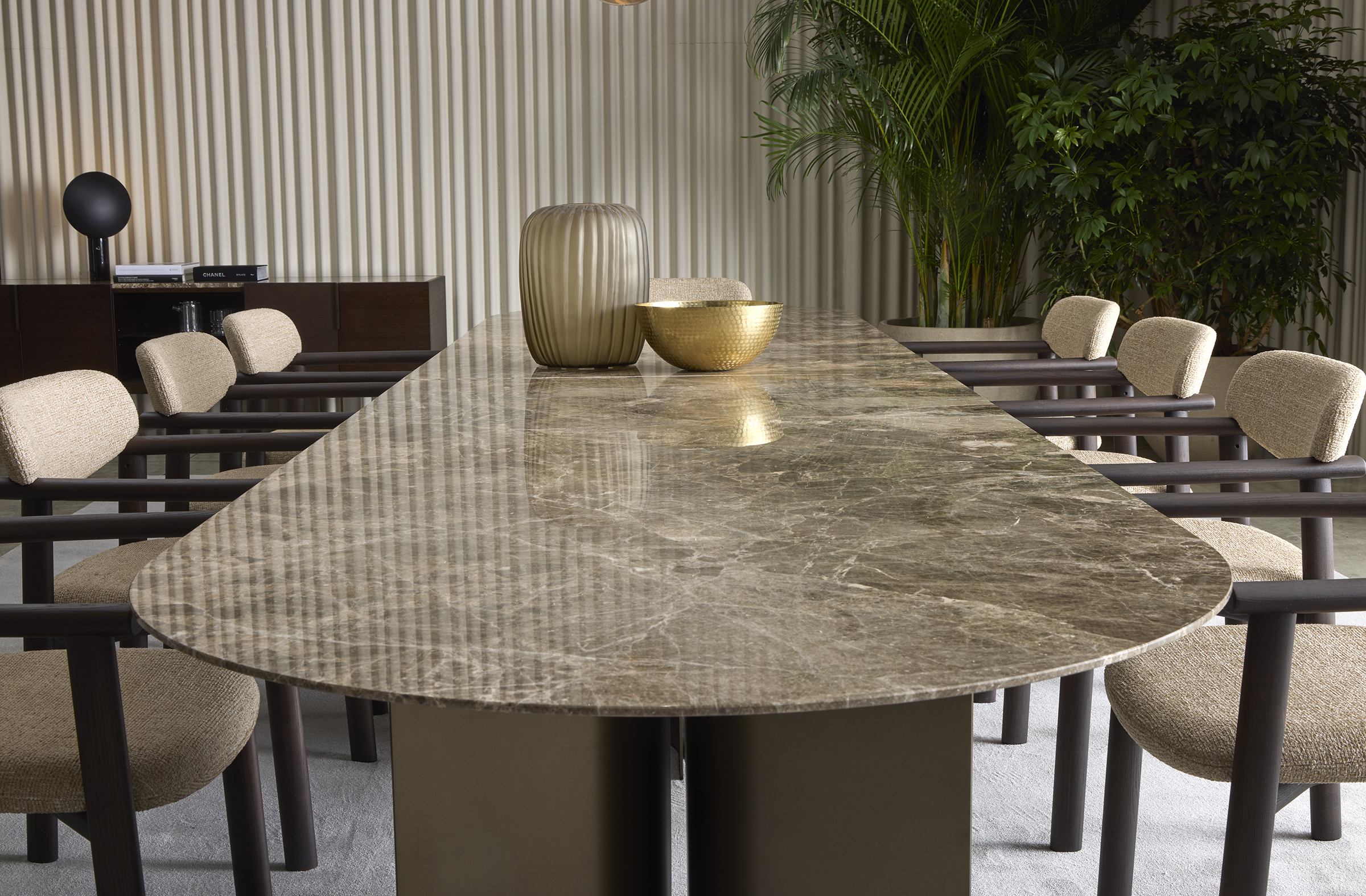 Обеденный стол Wave Dining от итальянской фабрики Giulio Marelli — воплощение элегантности и универсальности в премиальном дизайне. Стол отличается легкостью и сценическим присутствием благодаря тонко закругленным ножкам, которые создают эффектный контраст с массивной столешницей.