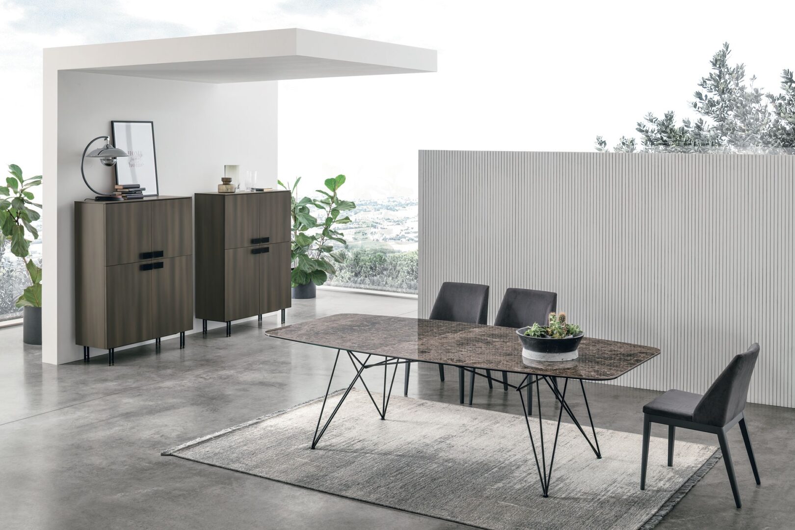 Идеальное сочетание минималистичного стиля и привлекательных материалов. Металлические стержни основания этого стола геометрически изгибаются, поддерживая столешницу, которая может быть выполнена в различных вариантах отделки.