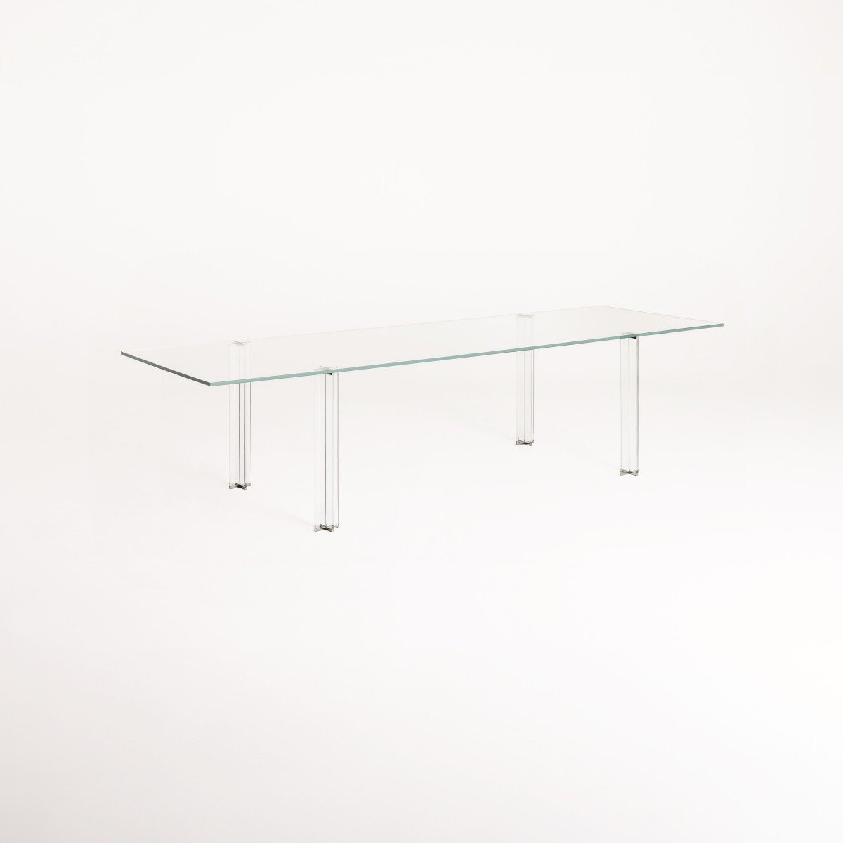 Высокий стол квадратной, круглой, овальной или прямоугольной формы со столешницей из прозрачного сверхлегкого или дымчатого стекла толщиной 15 мм или из ламинированного стекла “blue paste glass” толщиной 8+8 мм. Ножки из сверхлегкого закаленного стекла толщиной 10 мм, окрашенного в дымчатый или синий цвет, с УФ-покрытием, съемные и крепятся к столешнице с помощью сложных пластин из зеркально отполированной нержавеющей стали. Основание стола дополнено четырьмя ножками из зеркально отполированной нержавеющей стали, которые идеально вписываются в форму ножек.