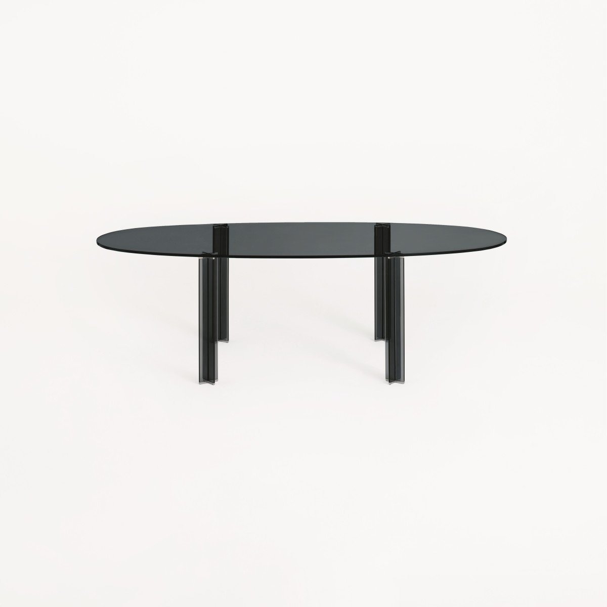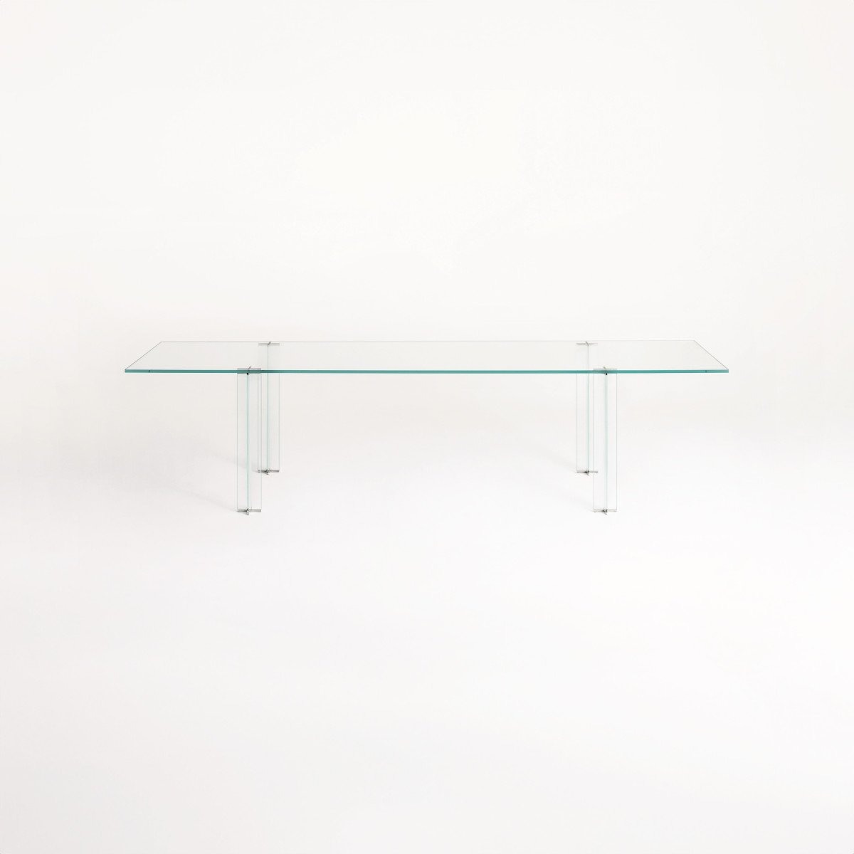 Столешница выполнена из прозрачного или дымчатого стекла толщиной 15 мм или из ламинированного стекла “blue paste glass” толщиной 8+8 мм. Ножки из сверхлегкого закаленного стекла толщиной 10 мм.