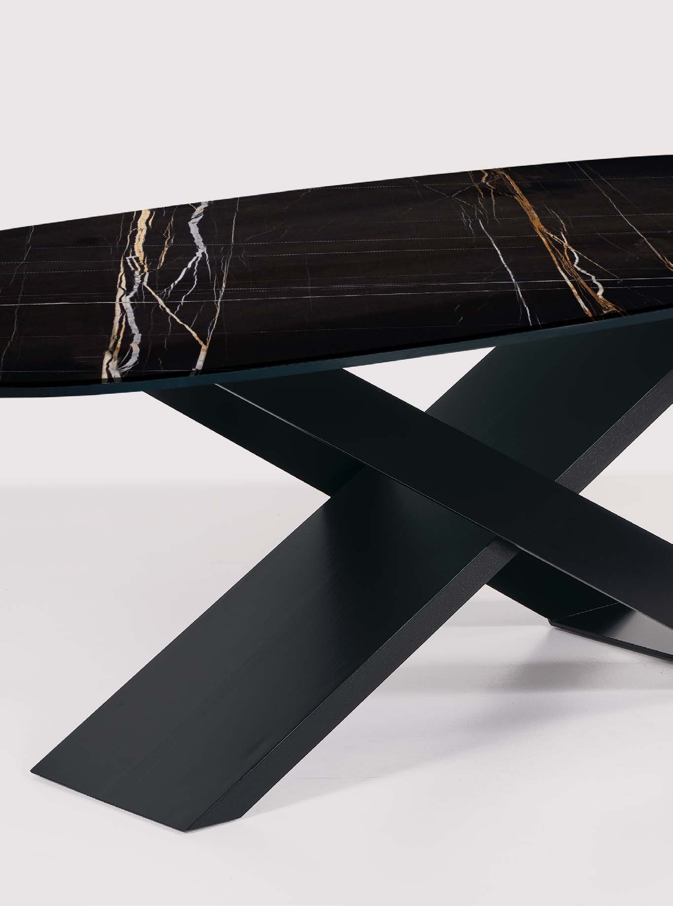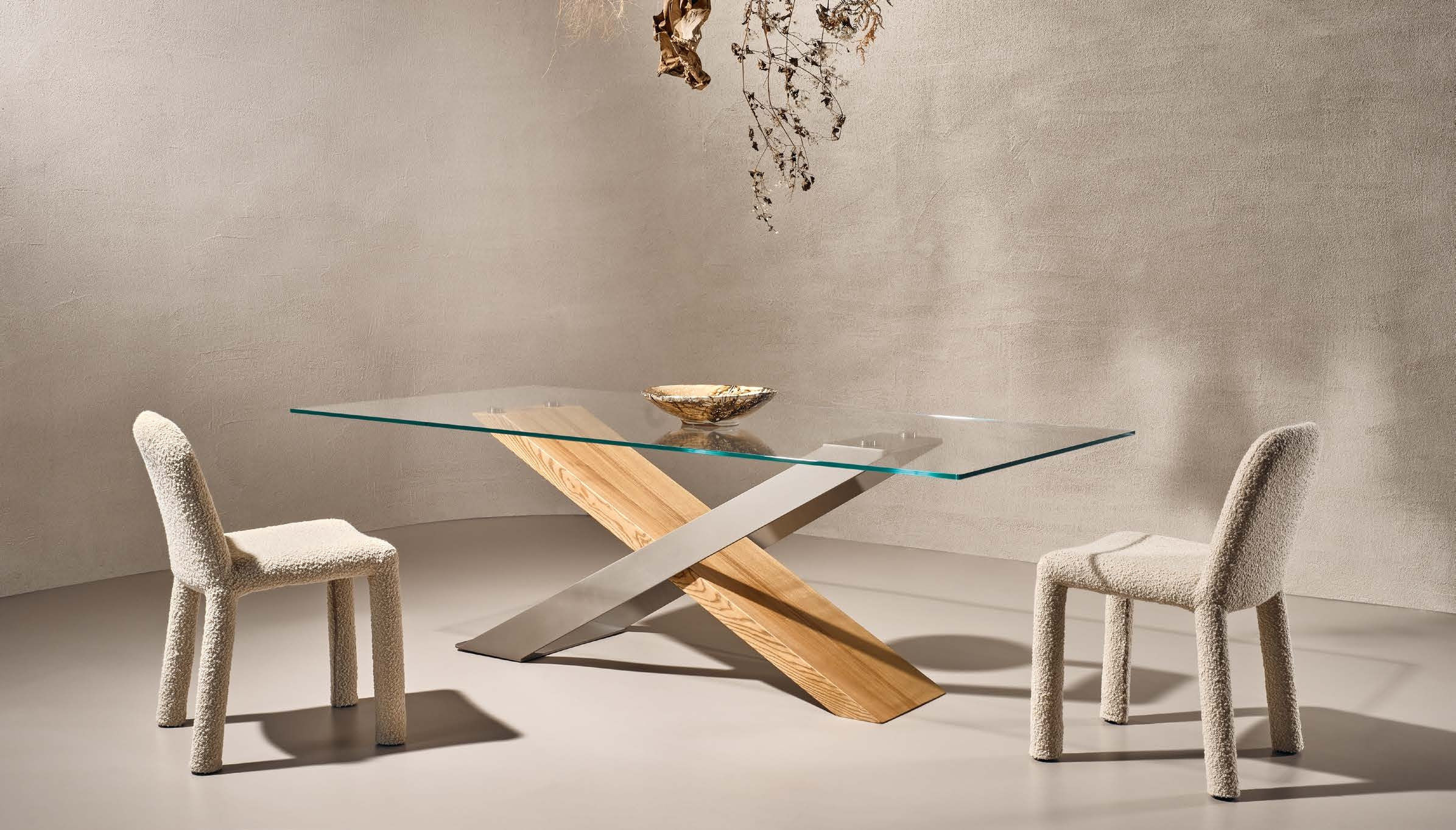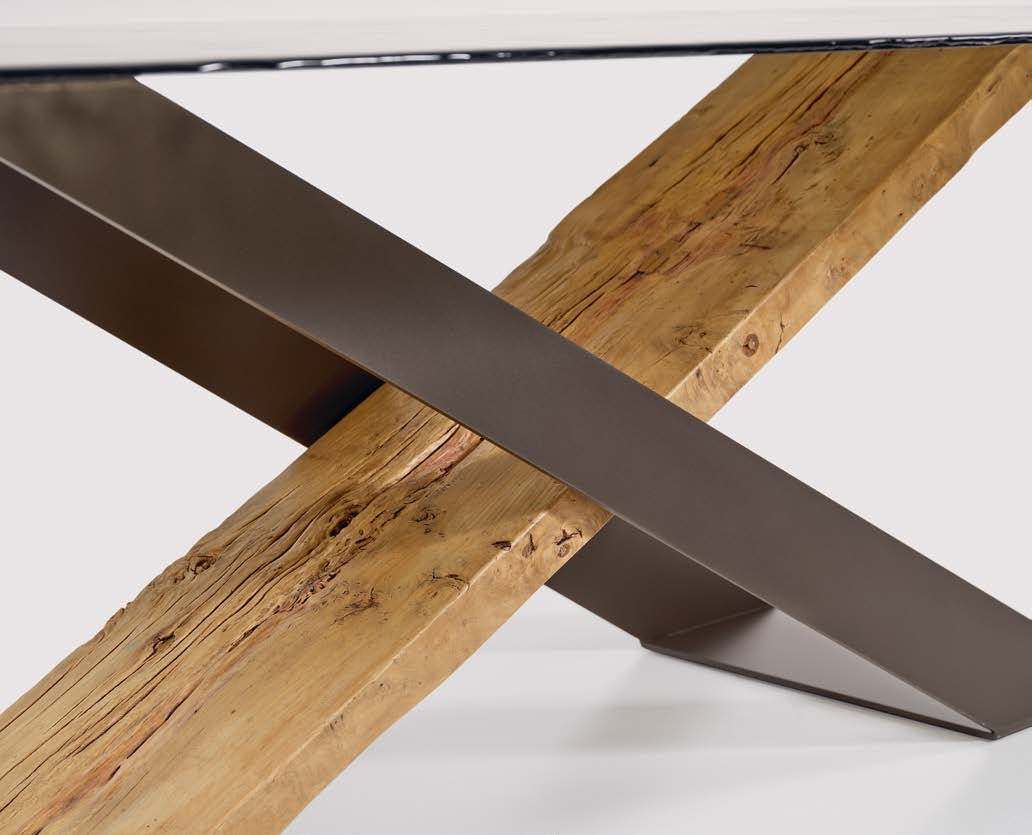 Стол X впечатляет своей лаконичной, но выразительной эстетикой. Основание из натурального дерева Secolare и коричневого металла создает эффектный контраст, подчеркивая глубину дизайна. Столешница из особо прозрачного стекла добавляет легкость и визуальную воздушность, делая стол идеальным решением как для просторных гостиных, так и для уютных обеденных зон. Этот предмет мебели — воплощение утонченного минимализма, где каждая линия продумана до мелочей.