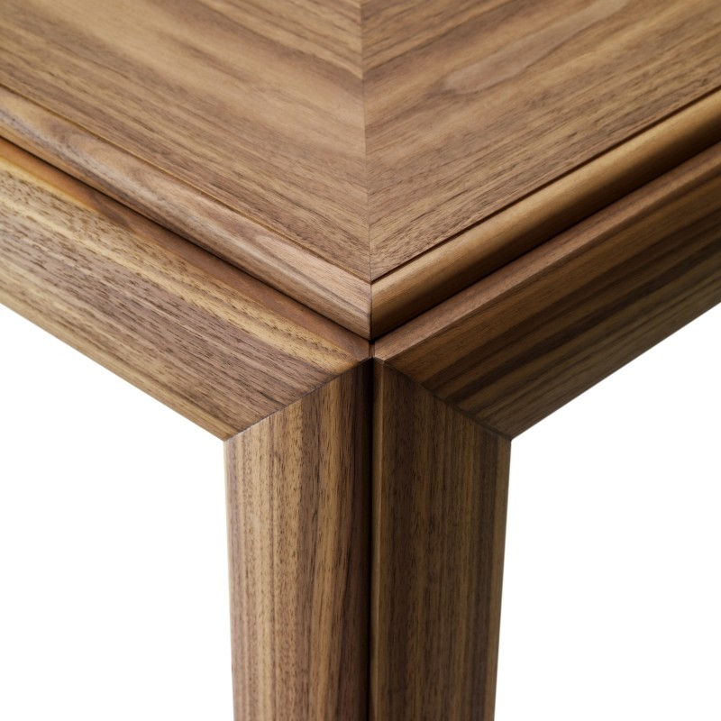 Квадратный стол с твердой деревянной рамой, столешницей из дерева, мрамора или стекла.