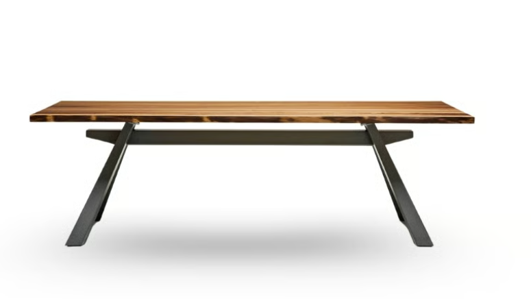 Стационарный стол Zeus с металлической конструкцией. Столешница может быть выполнена из хрусталя, шпона дерева, массива дерева или стекла. Мраморная столешница доступна исключительно в варианте 200х100 см.