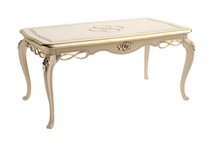Прямоугольный журнальный столик с мягкими линиями формы и драгоценными волнами и розами, вырезанными из сусального золота. Выделяющаяся специальная гравировка на столешнице — результат мастерства. Предмет мебели в классическом стиле, способный вернуть нас мыслями и эмоциями в атмосферу роскошных благородных гостиных.
