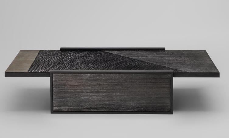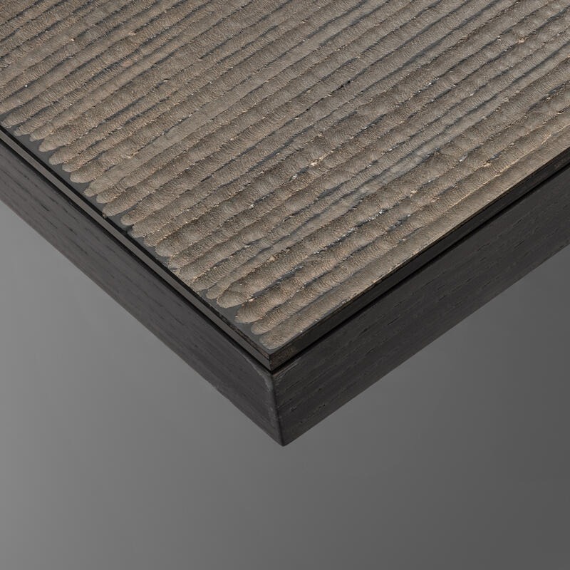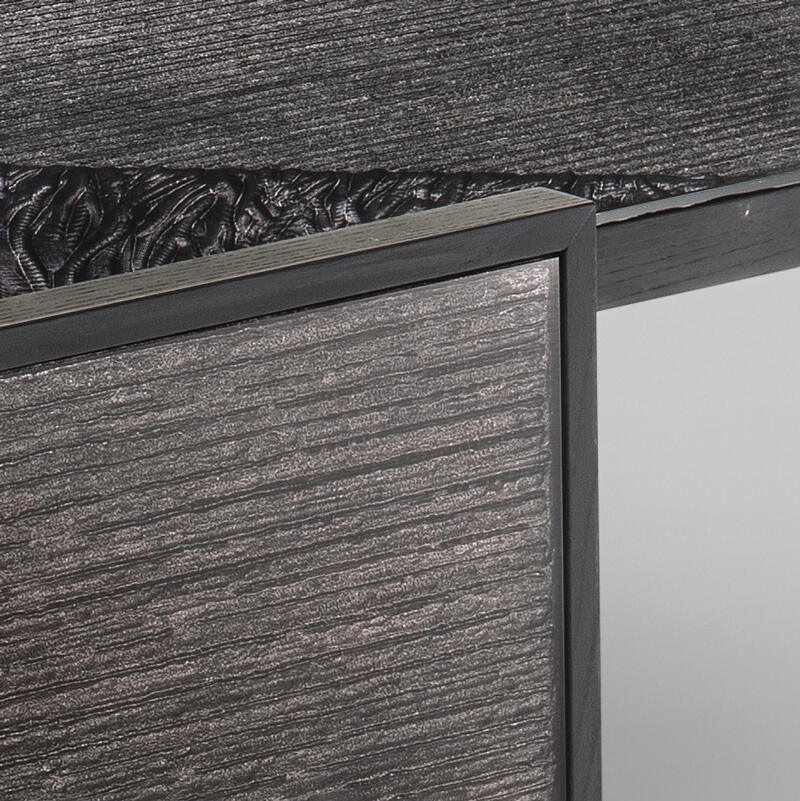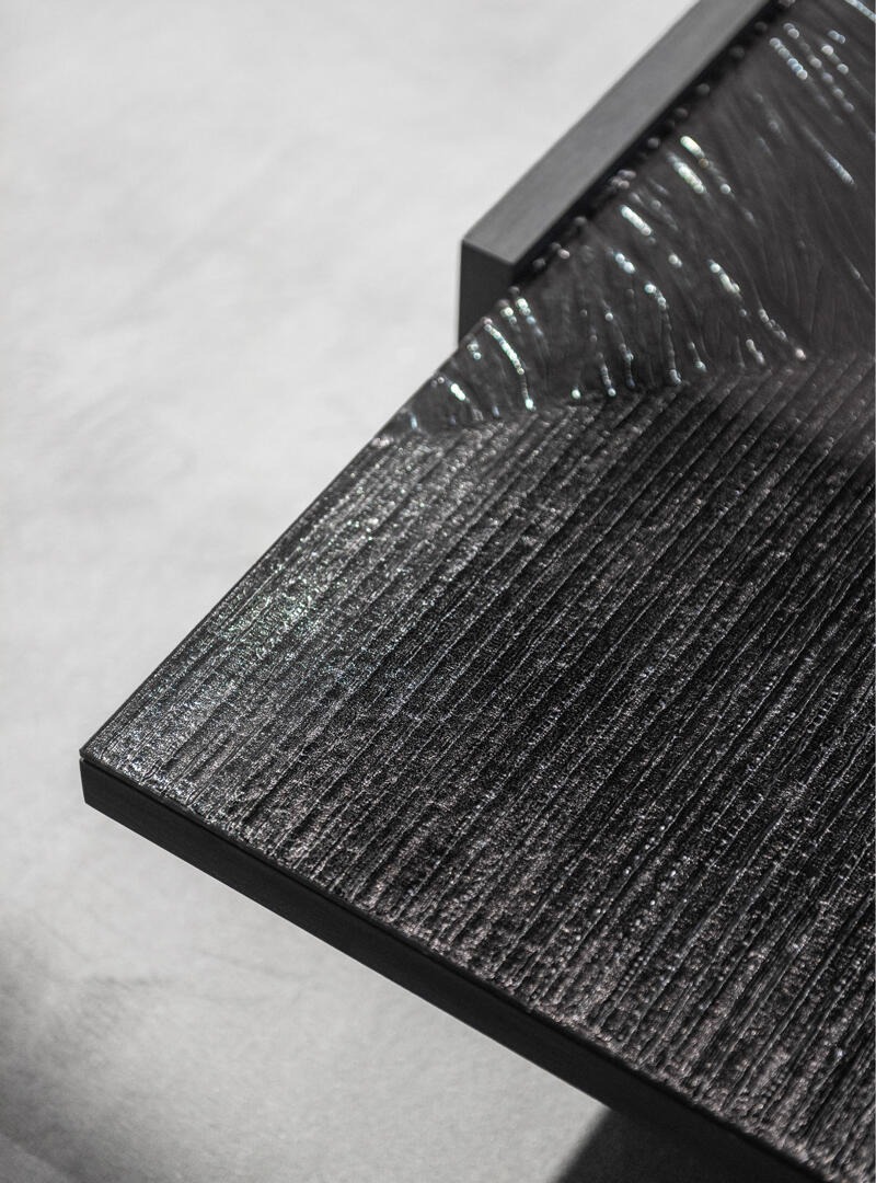 Рама изготовлена из ясеневой шпонированной фанеры, окрашенной в черный цвет. Верхняя и боковые части ножек выполнены из особо прозрачного стекла с гравировкой.