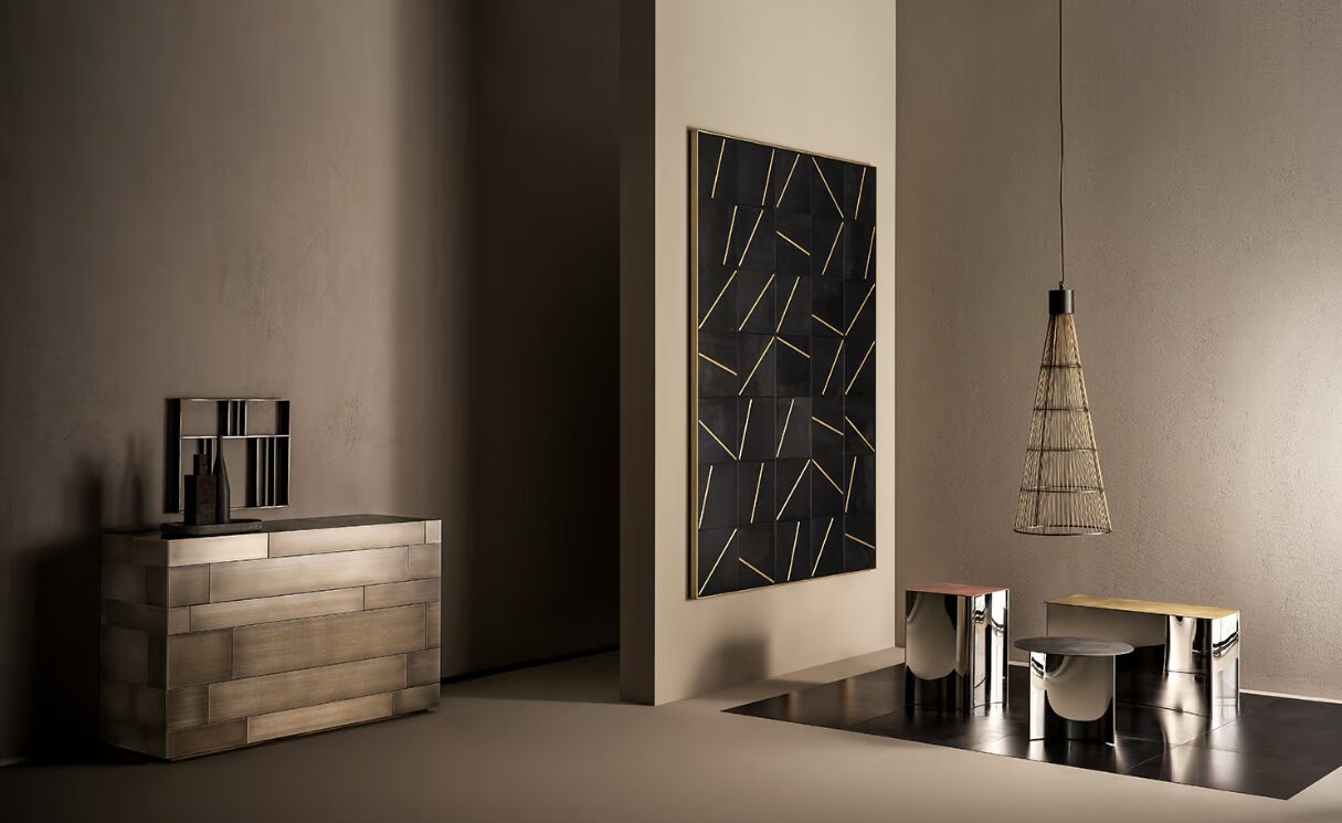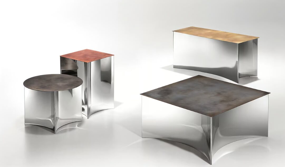 Цветовые вариации подчеркивают выразительность материалов, а вогнутая форма основания отражает сияние нержавеющей стали, контрастируя с текстурной геометрией столешниц DeLabré из меди, латуни и нержавеющей стали.