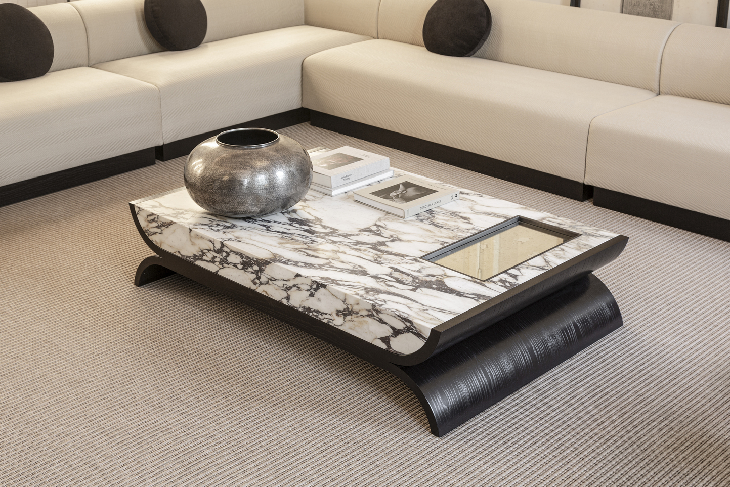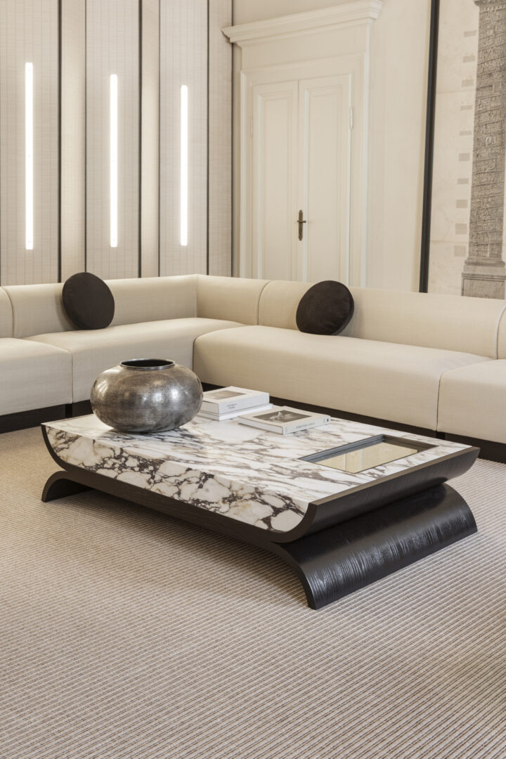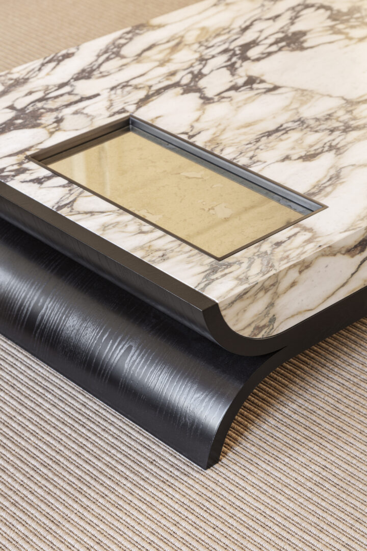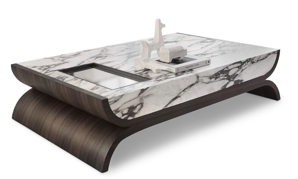 В журнальном столике Alcova мастерски сочетаются легкость и солидность. Его столешница из толстого мрамора, тщательно выдолбленная изнутри для уменьшения веса, придает ему смелый и прочный вид, а гладкая полированная поверхность элегантно контрастирует с несущей конструкцией.