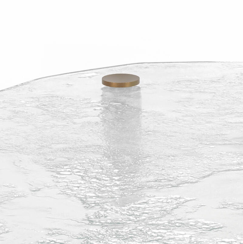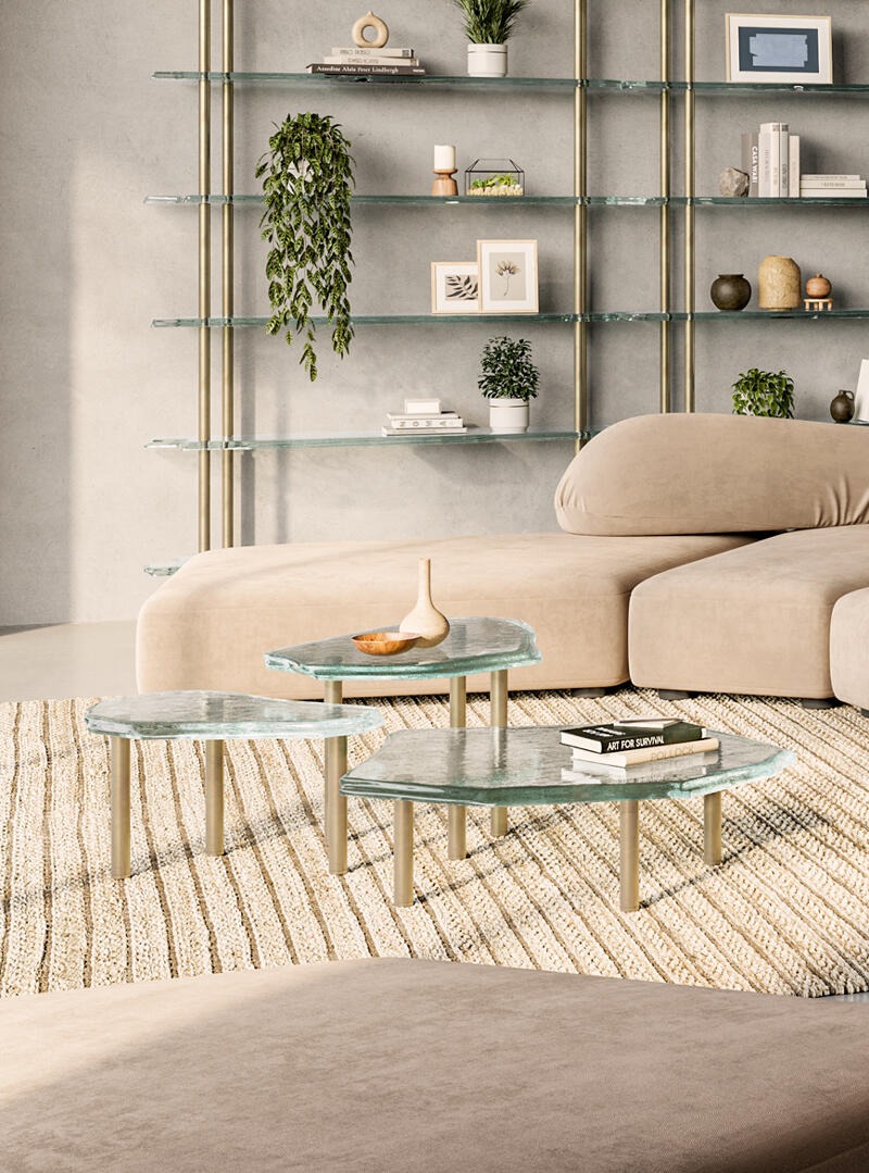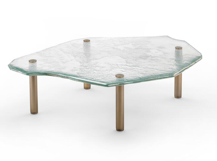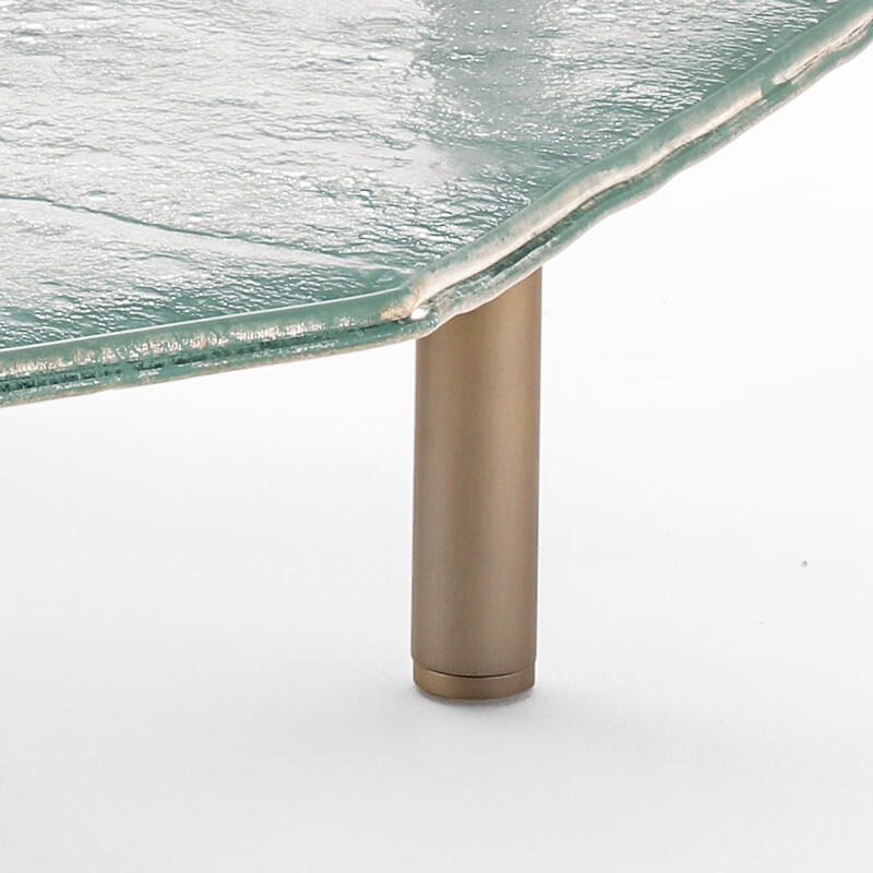 Металлические ножки с отделкой из полированной латуни. Столешница из обожженного стекла в два слоя с неровными краями и частичным посеребрением с обратной стороны.