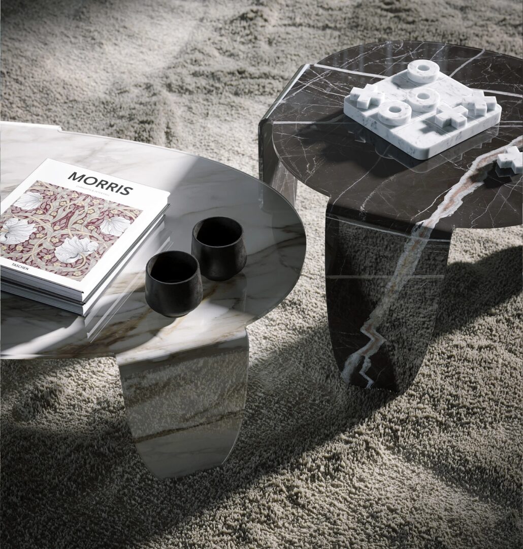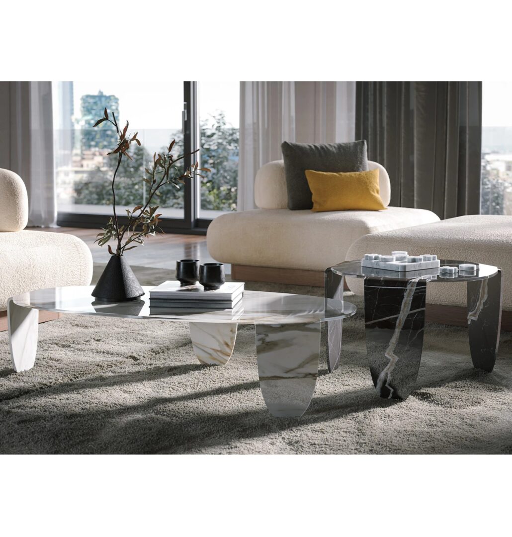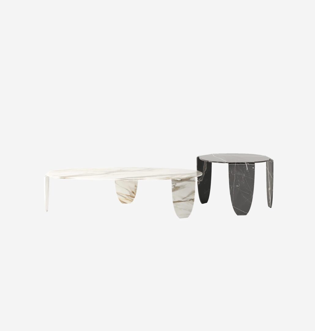 Изготовленные из цельного куска изогнутого стекла, эти предметы мебели превращаются в настоящие скульптурные работы, усиленные эксклюзивной отделкой Calacatta и Calacatta Black. Ода изысканности, которая дает ощущение сдержанной и Moderna роскоши.