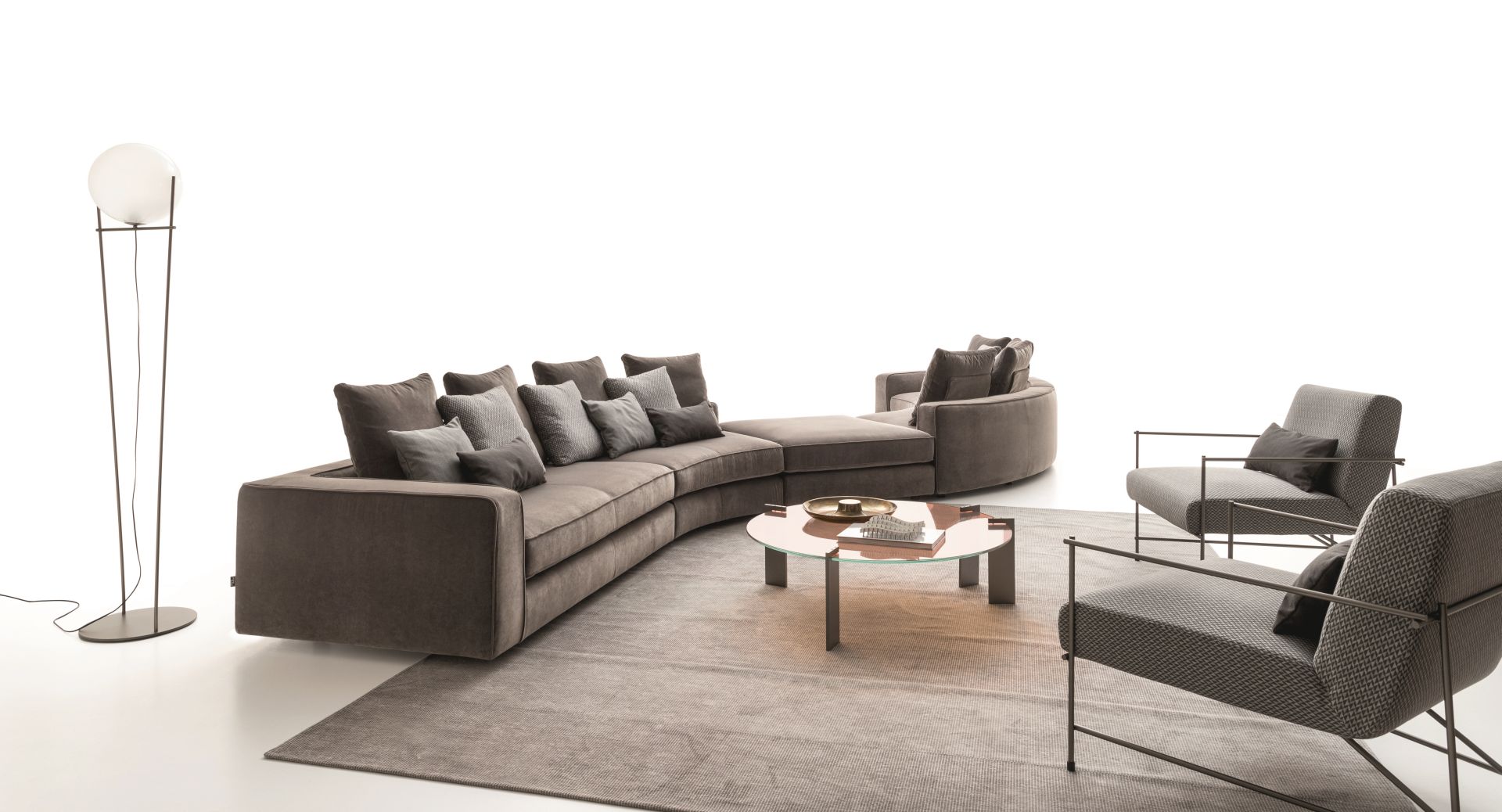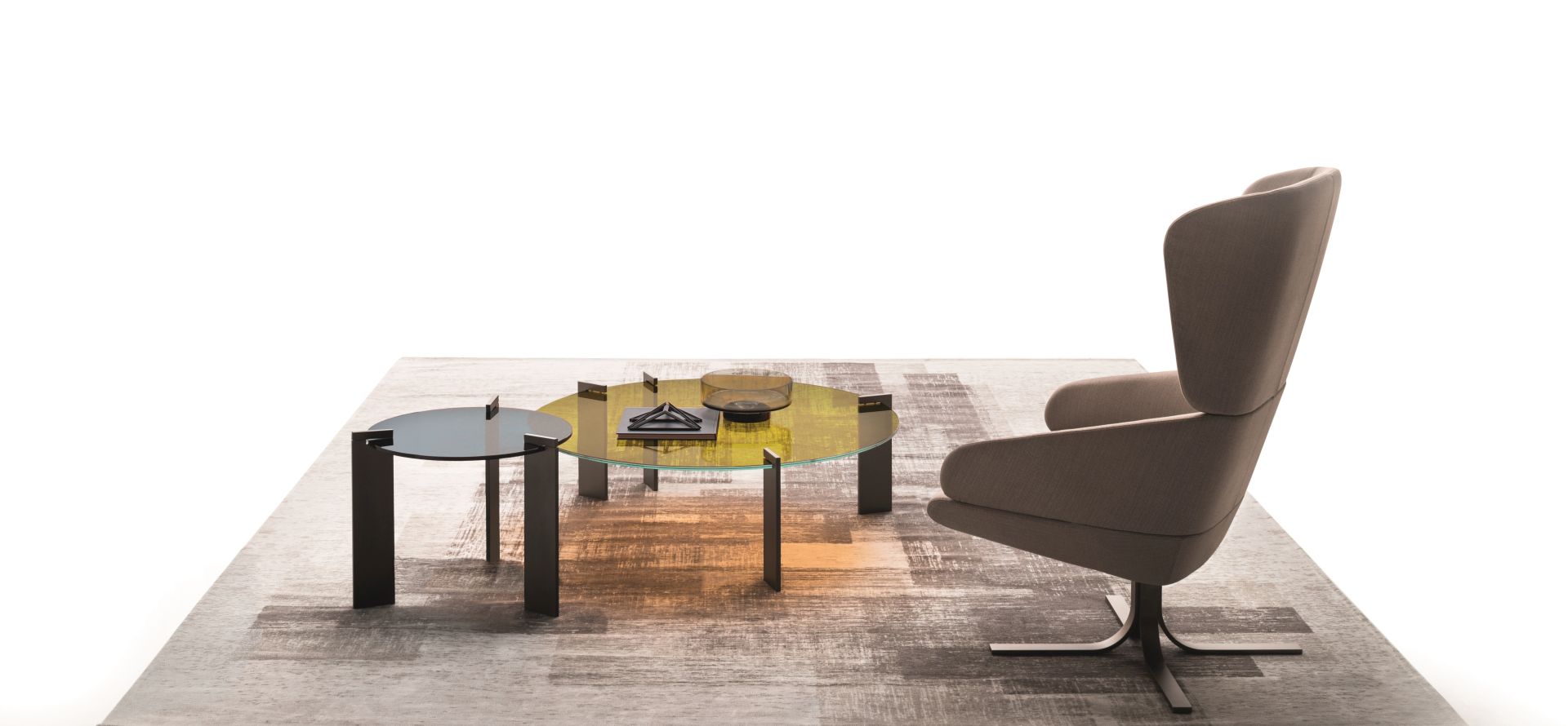 Прозрачное стекло является ведущей темой серии Aulos. Металлическая структура — наипростейшая система поддержки. Пять прозрачных оттенков, уникальных в своей необычности. Две высоты и два размера. Асимметричное размещение поддерживающих ножек большого столика усиливает уникальный характер этой коллекции.