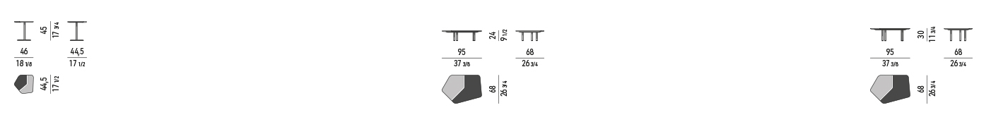 Журнальные столики имеют размеры 95×68 см и 160×89 см (с регулируемой высотой). Приставная модель — 46×44,5 см.