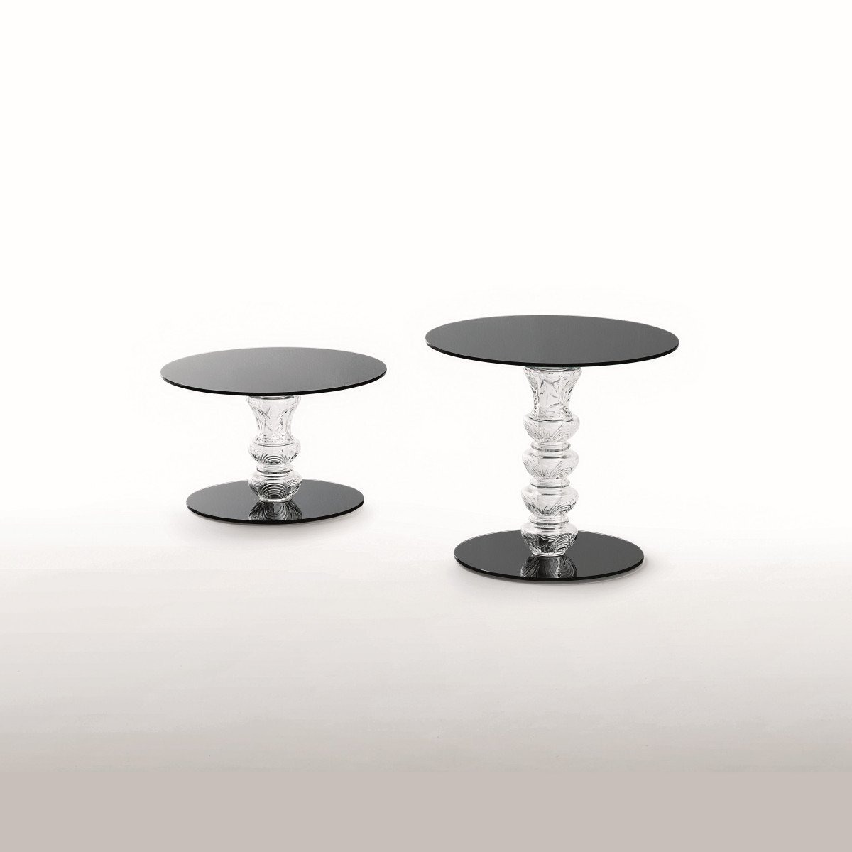 Круглые низкие столики доступны в двух вариантах высоты со столешницей и ножкой из закаленного глянцевого лакированного стекла толщиной 8 мм. Основание выполнено из выдувного стекла фасонной формы с гравировкой на поверхности.