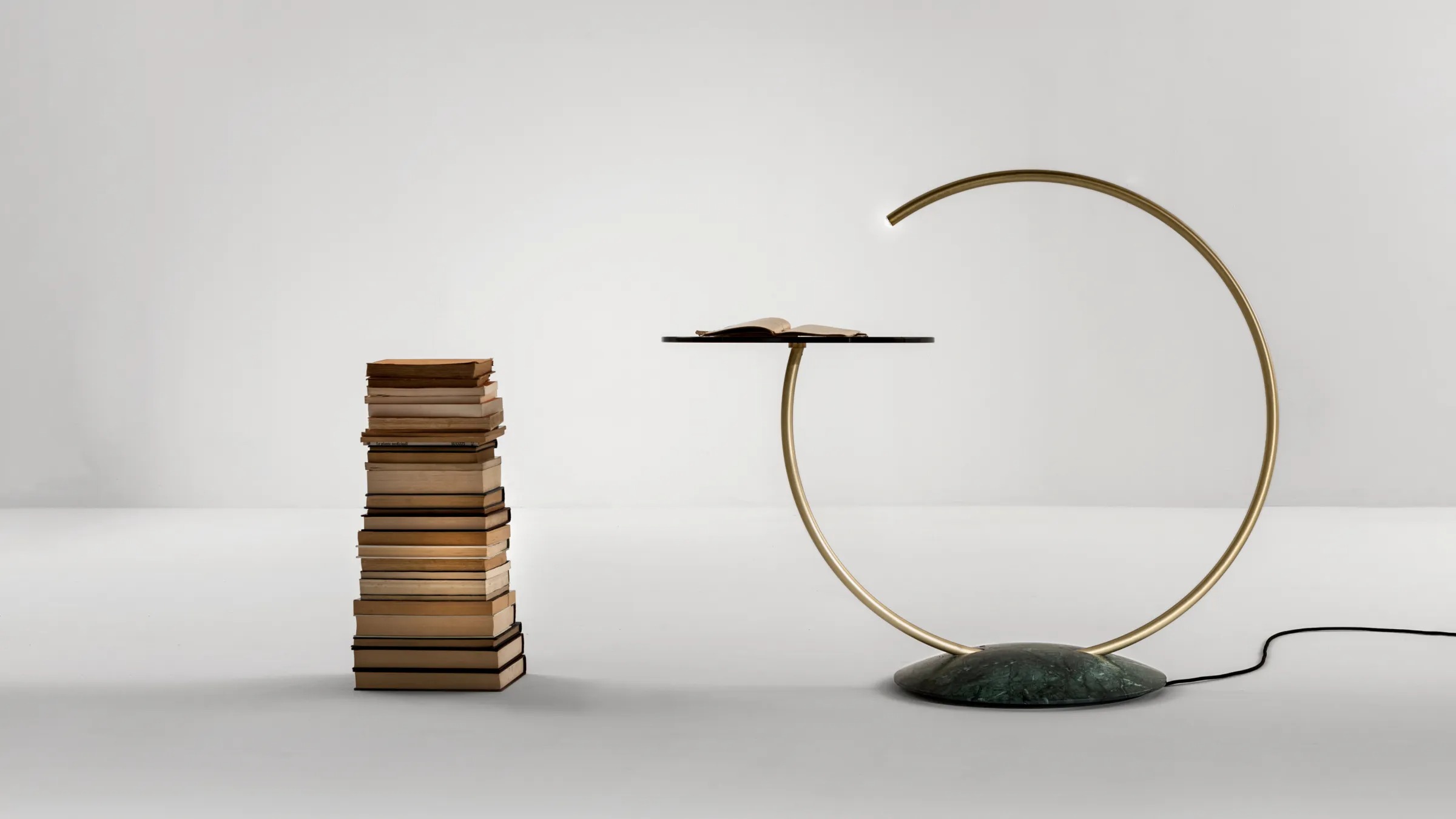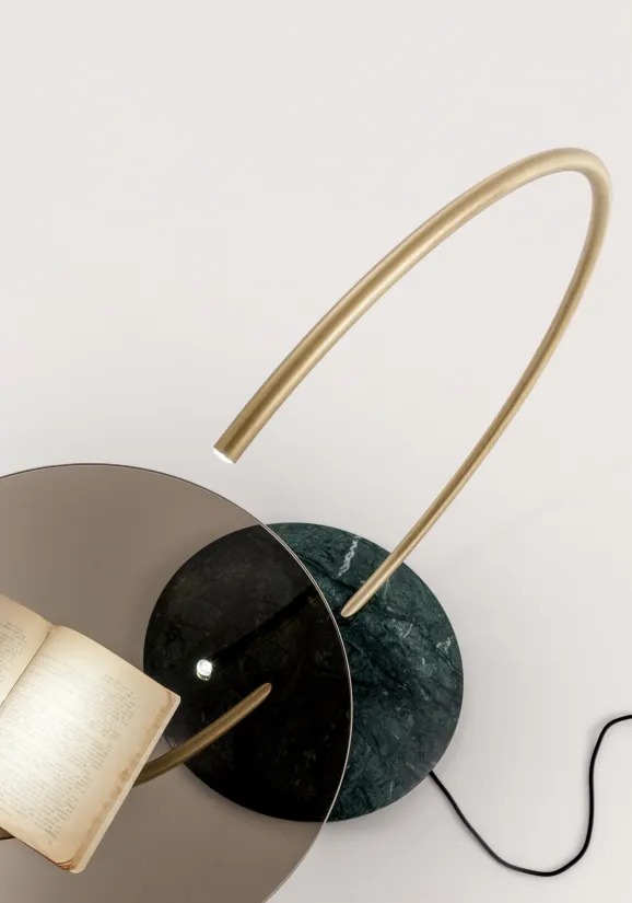 Журнальный столик с встроенным освещением, структура из матовой латуни, основание из мрамора и круглый столешницей из бронзового стекла.