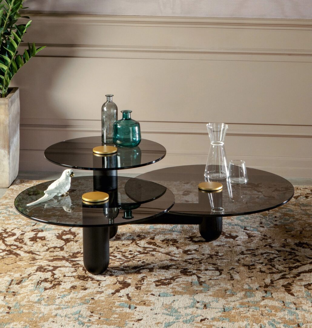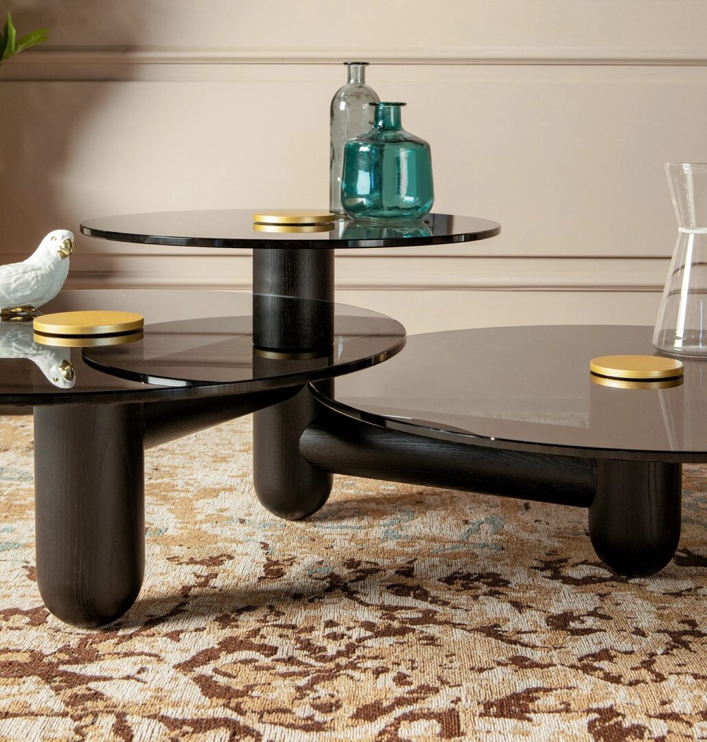 Элегантность и гармония чистых форм характеризуют журнальный столик Cosmo, состоящий из трех стеклянных вершин с центральной кнопкой из сатинированного золота и цельной деревянной основой. Различные высоты трех этажей усиливают их мощную эстетику.
