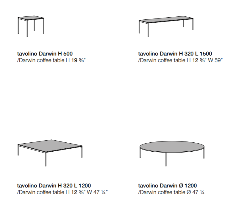 Журнальные столики из коллекции Darwin доступны с круглыми или квадратными столешницами различных размеров и высоты. Стальное основание из черной эпоксидной смолы, стандартное металлическое покрытие или хром, а столешница из матового стекла, покрытого лаком с обратной стороны, с эффектом полированного мрамора, стандартное металлическое покрытие или керамика.